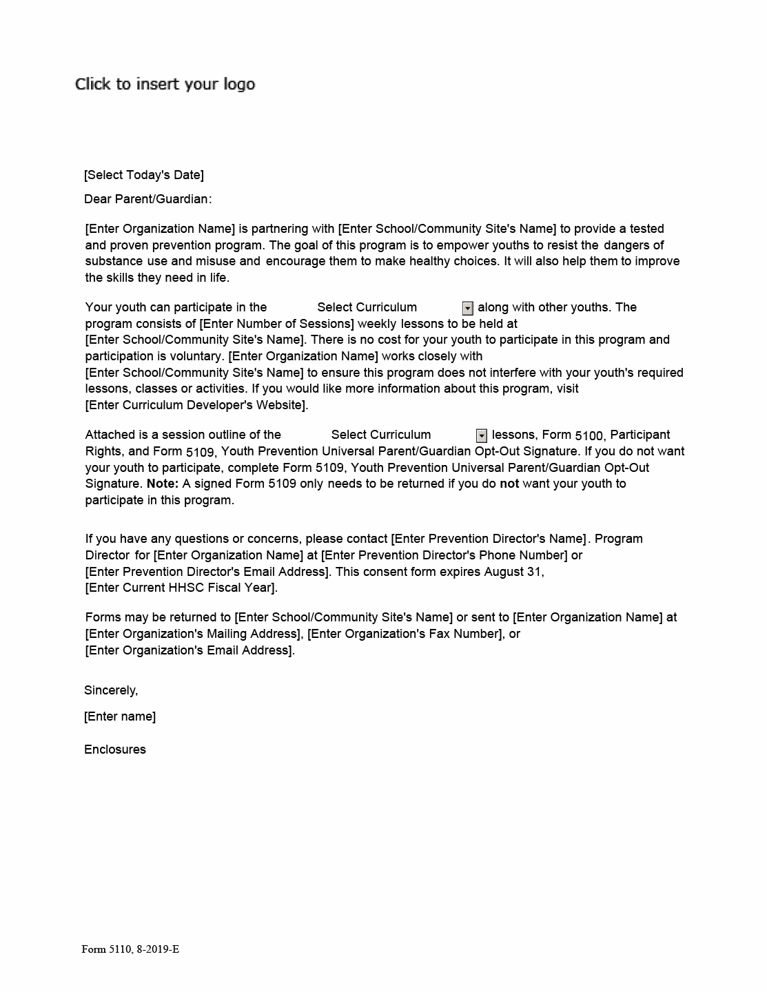TX HHS Form 5110. Youth Prevention Universal Program Participation Letter