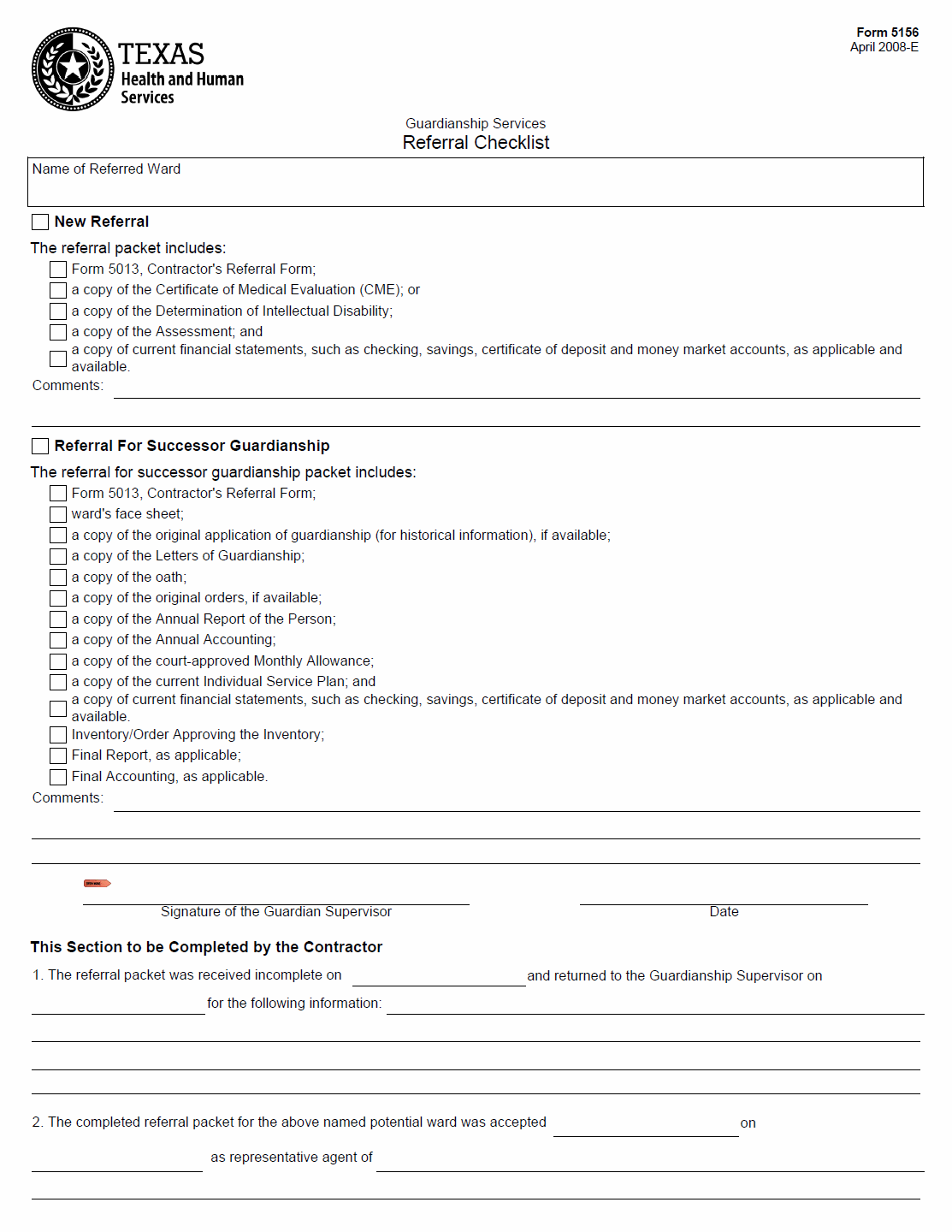 This form is typically used in scenarios where a referral is being made for either initial or successor guardianship. It is essential to complete this form accurately and thoroughly to ensure that all necessary information is provided to support the referral process. By using the TX HHS Form 5156, Referral Checklist, individuals can streamline their workflow and efficiently facilitate the referral of potential wards.