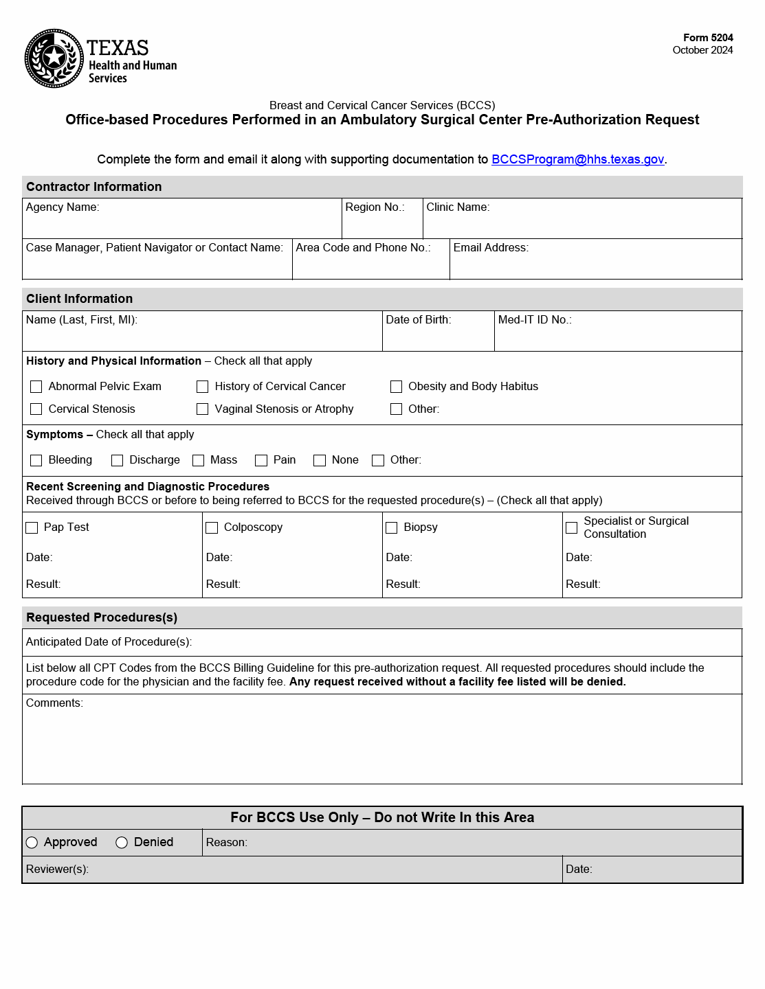 The TX HHS Form 5204, "Office-based Procedures Performed in an Ambulatory Surgical Center Pre-Authorization Request", is a crucial document for healthcare professionals seeking pre-authorization for office-based procedures performed in ambulatory surgical centers. This form helps solve the problem of obtaining prior approval from Breast and Cervical Cancer Services (BCCS) before initiating treatment.