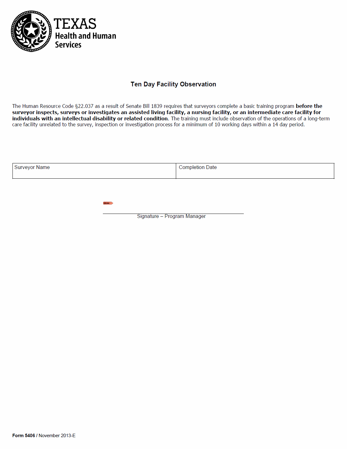 TX HHS Form 5406: Ten Day Facility Observation is a crucial document used by surveyors to complete their basic training program before inspecting, surveying, or investigating assisted living facilities, nursing facilities, or intermediate care facilities for individuals with an intellectual disability or related condition. This form helps ensure that surveyors have gained hands-on experience observing the operations of a long-term care facility unrelated to the survey process.
