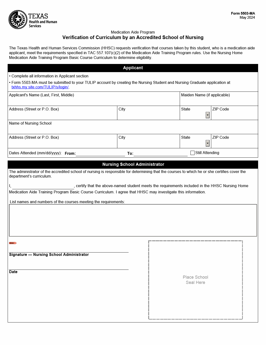 The TX HHS Form 5503-MA, "Verification of Curriculum by an Accredited School of Nursing", is a crucial document for medication aide applicants in Texas. This form helps solve the problem of verifying that courses taken by the applicant meet the requirements specified in the Medication Aide Training Program rules.