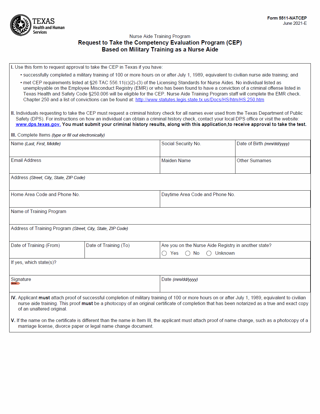 TX HHS Form 5511-NATCEP. Request to Take the Competency Evaluation Program (CEP) Based on Military Training as a Nurse Aide