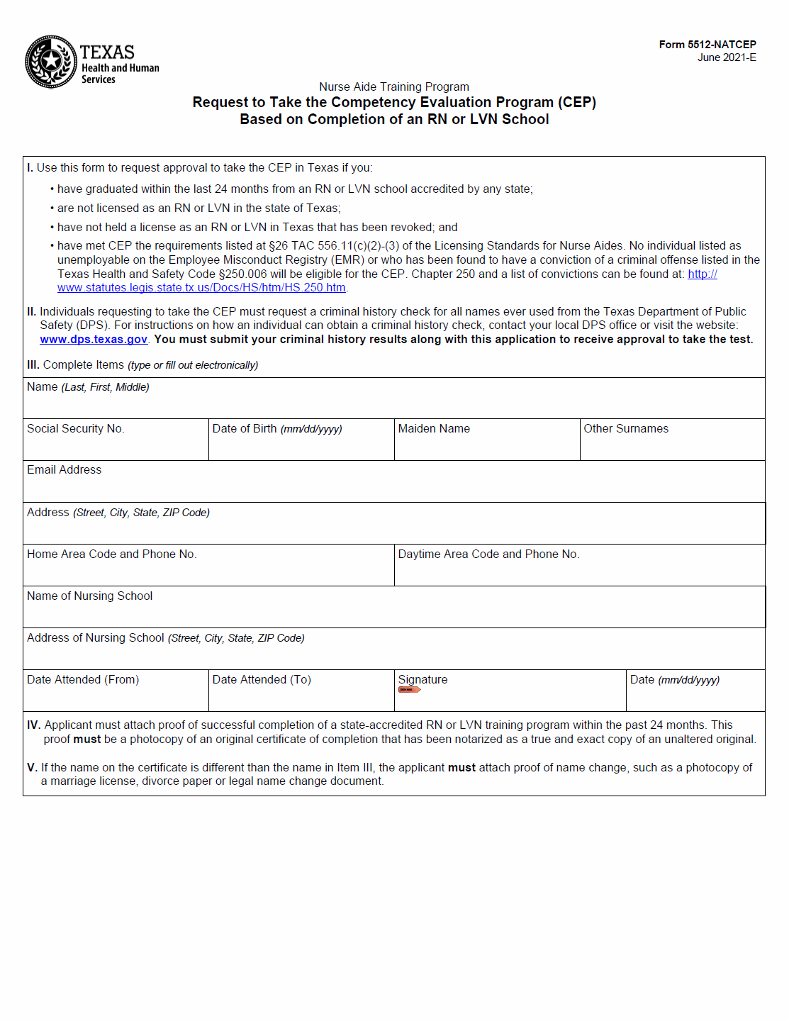 TX HHS Form 5512-NATCEP. Request to Take the Competency Evaluation Program (CEP) Based on Completion of an RN or LVN School