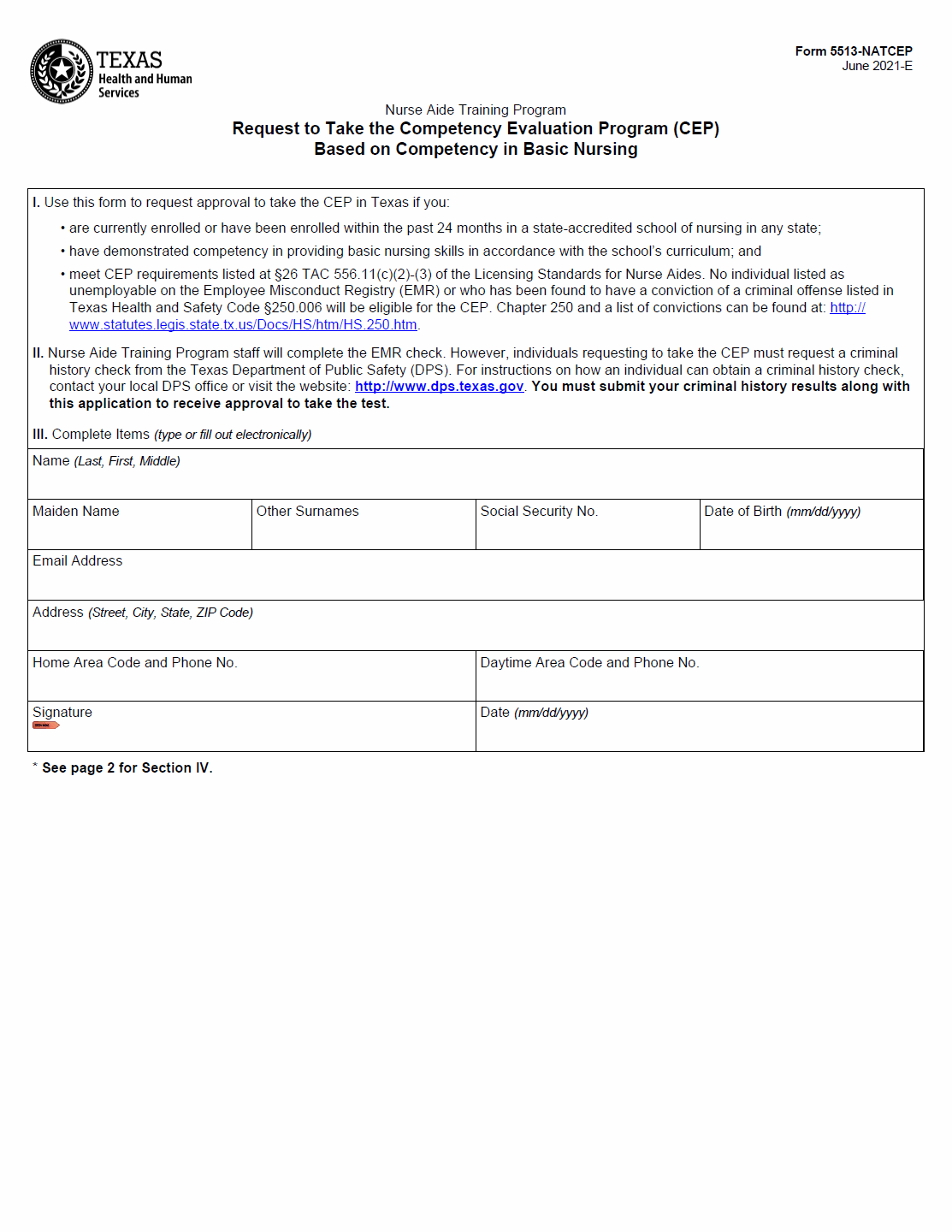 TX HHS Form 5513-NATCEP. Request to Take the Competency Evaluation Program (CEP) Based on Competency in Basic Nursing Skills as an RN/LVN Student