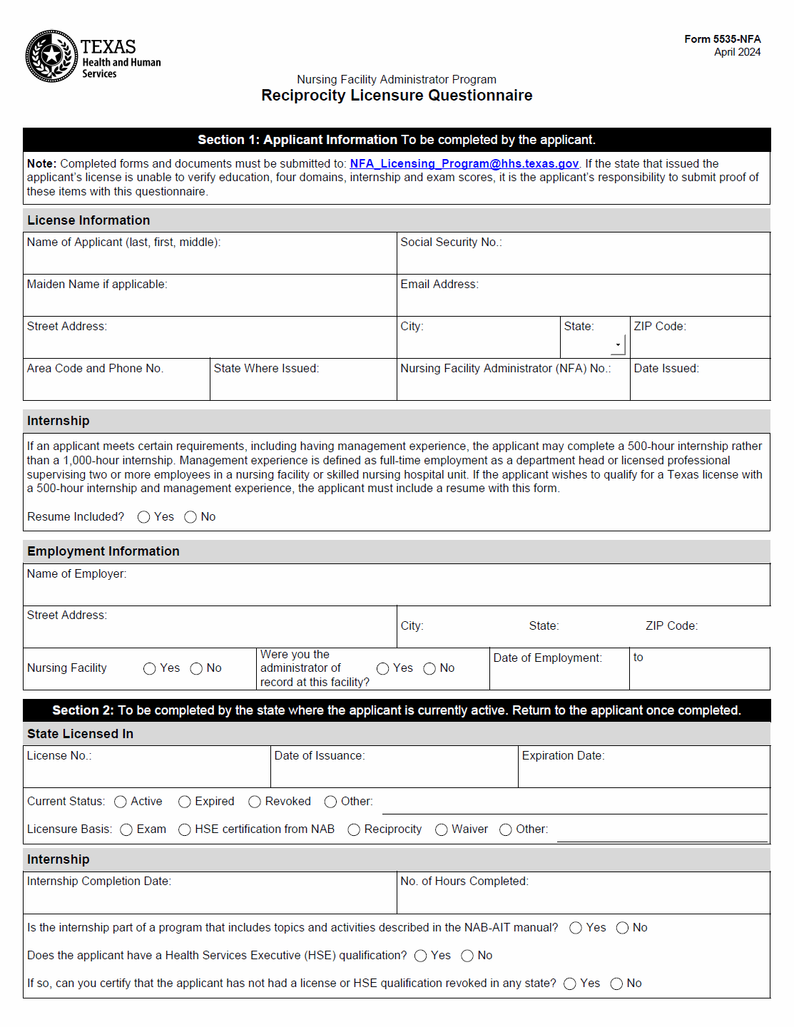 TX HHS Form 5535. Reciprocity Licensure Questionnaire
