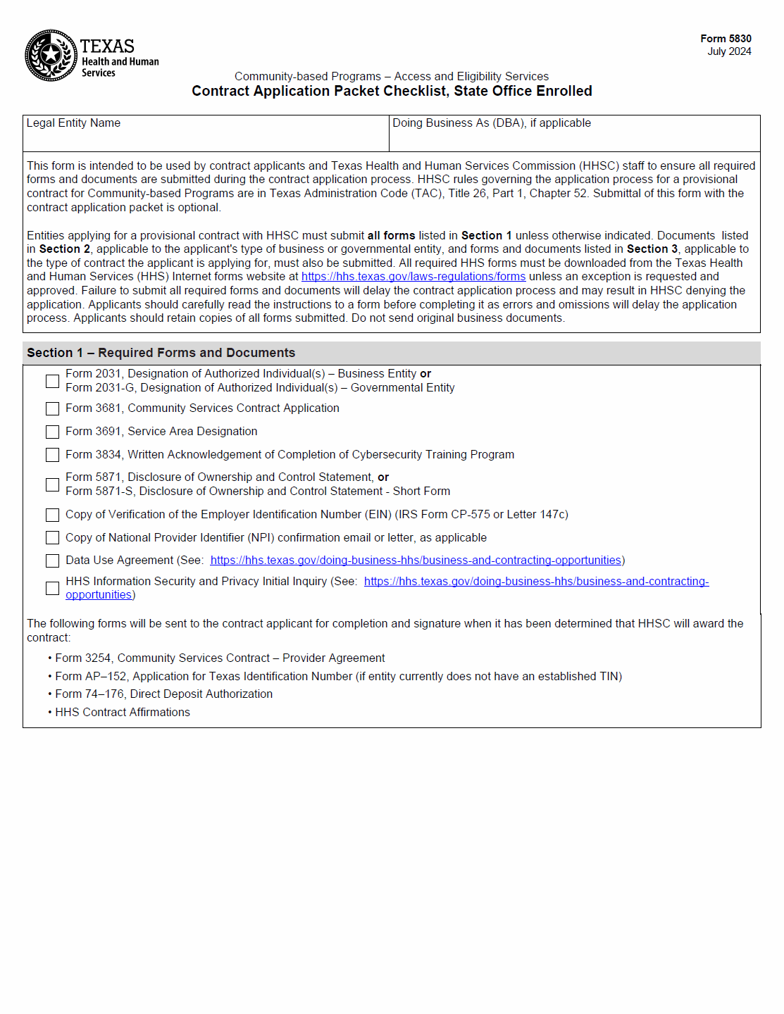 TX HHS Form 5830. Community-based Programs – Access and Eligibility Services Contract Application Packet Checklist. State Office Enrolled