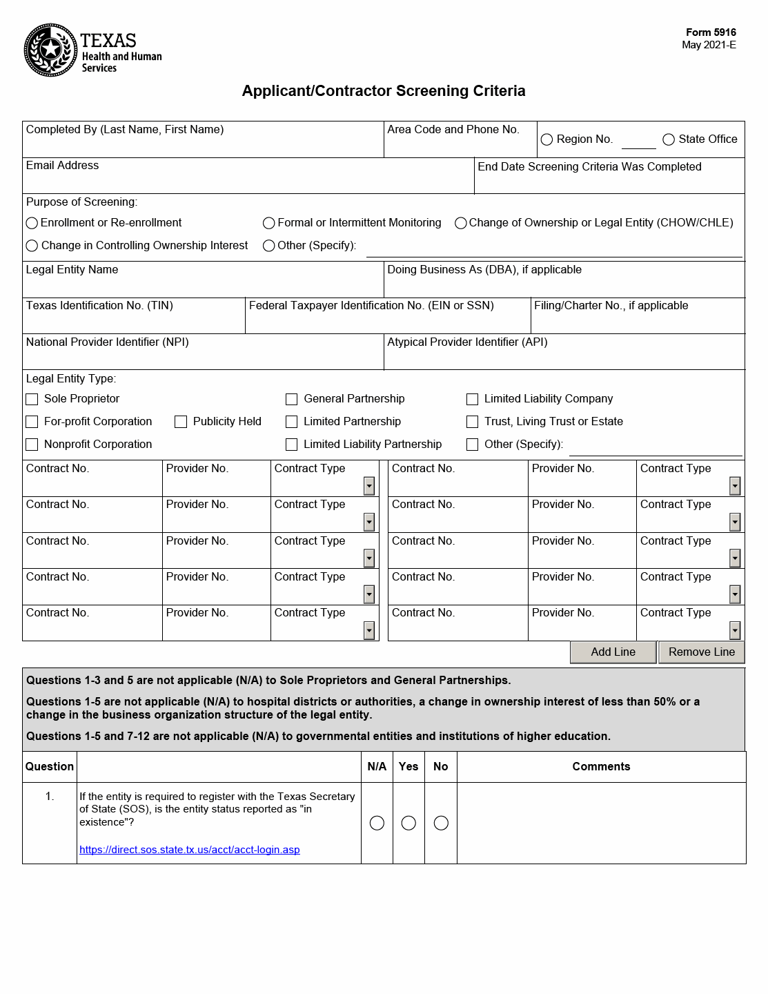 TX HHS Form 5916. Applicant/Contractor Screening Criteria