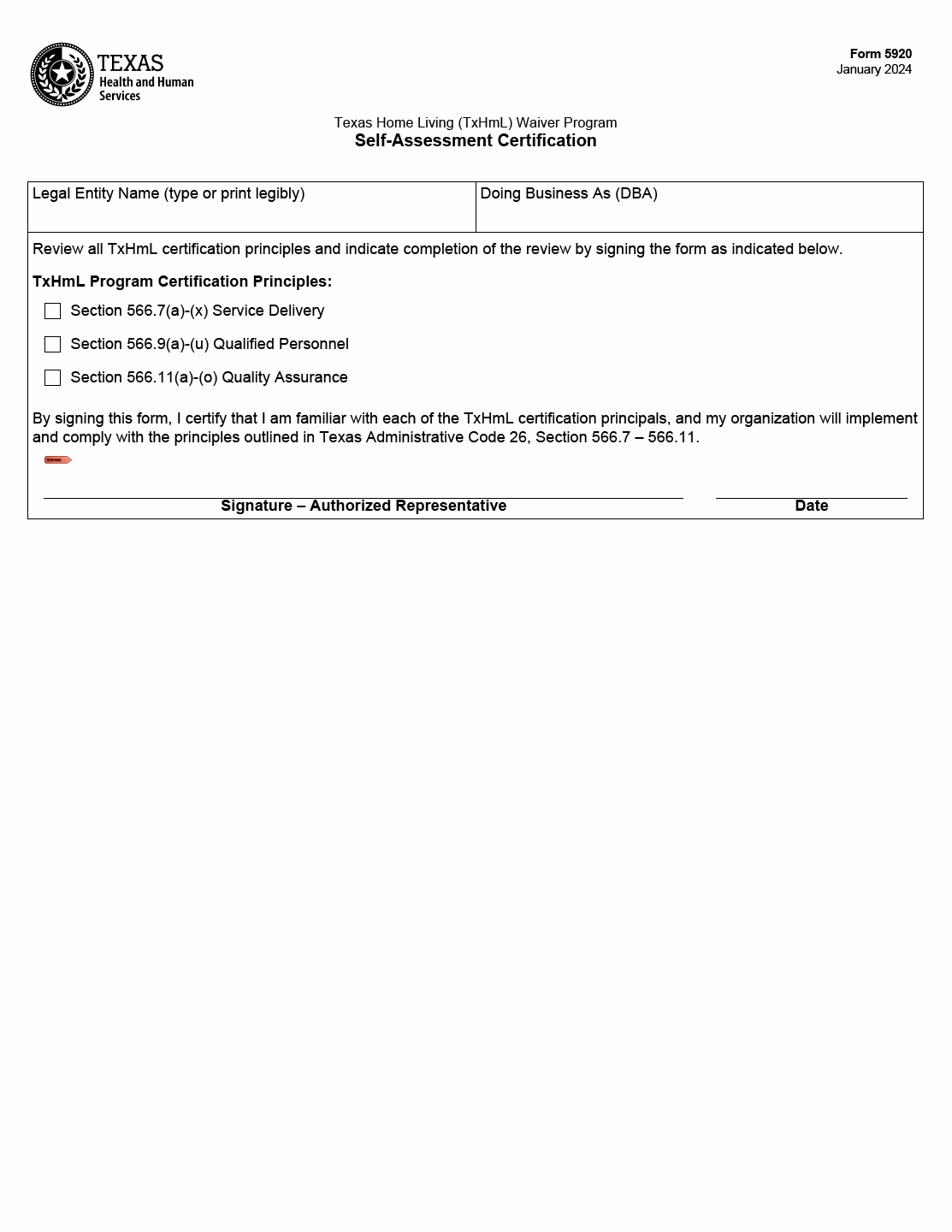 TX HHS Form 5920. TxHmL Waiver Program Self-Assessment Certification