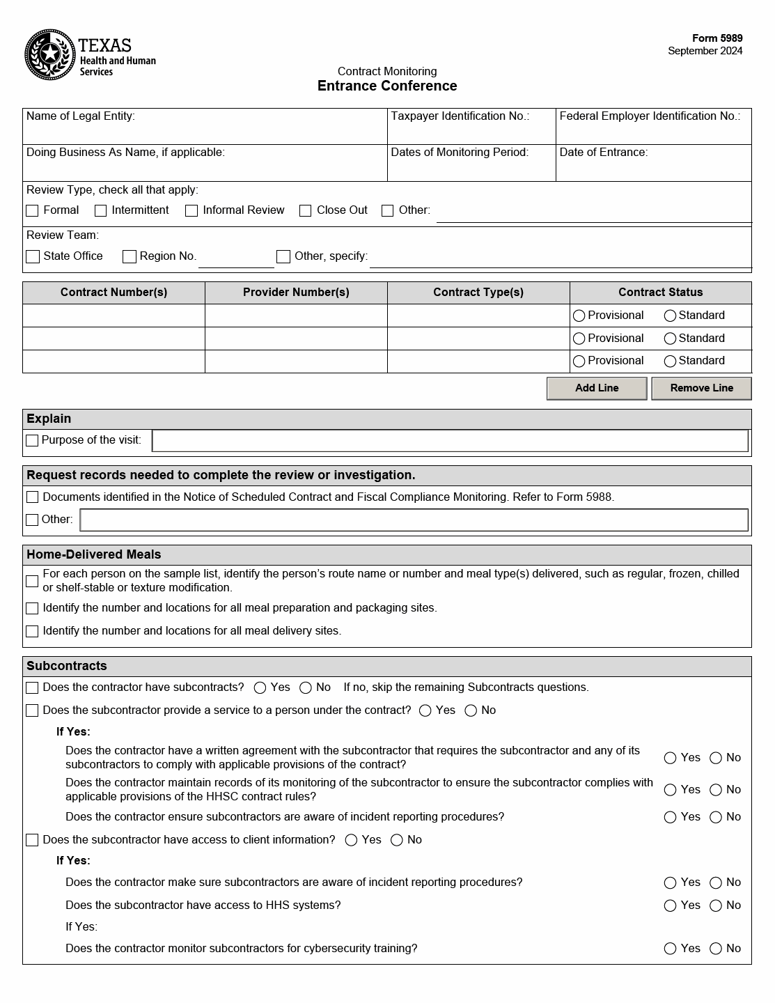 TX HHS Form 5989. Contract Monitoring Entrance Conference