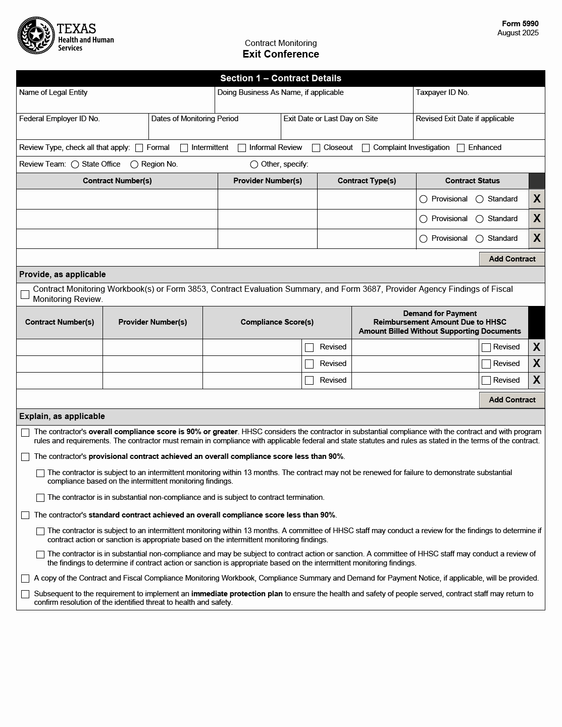 TX HHS Form 5990. Contract Monitoring Exit Conference