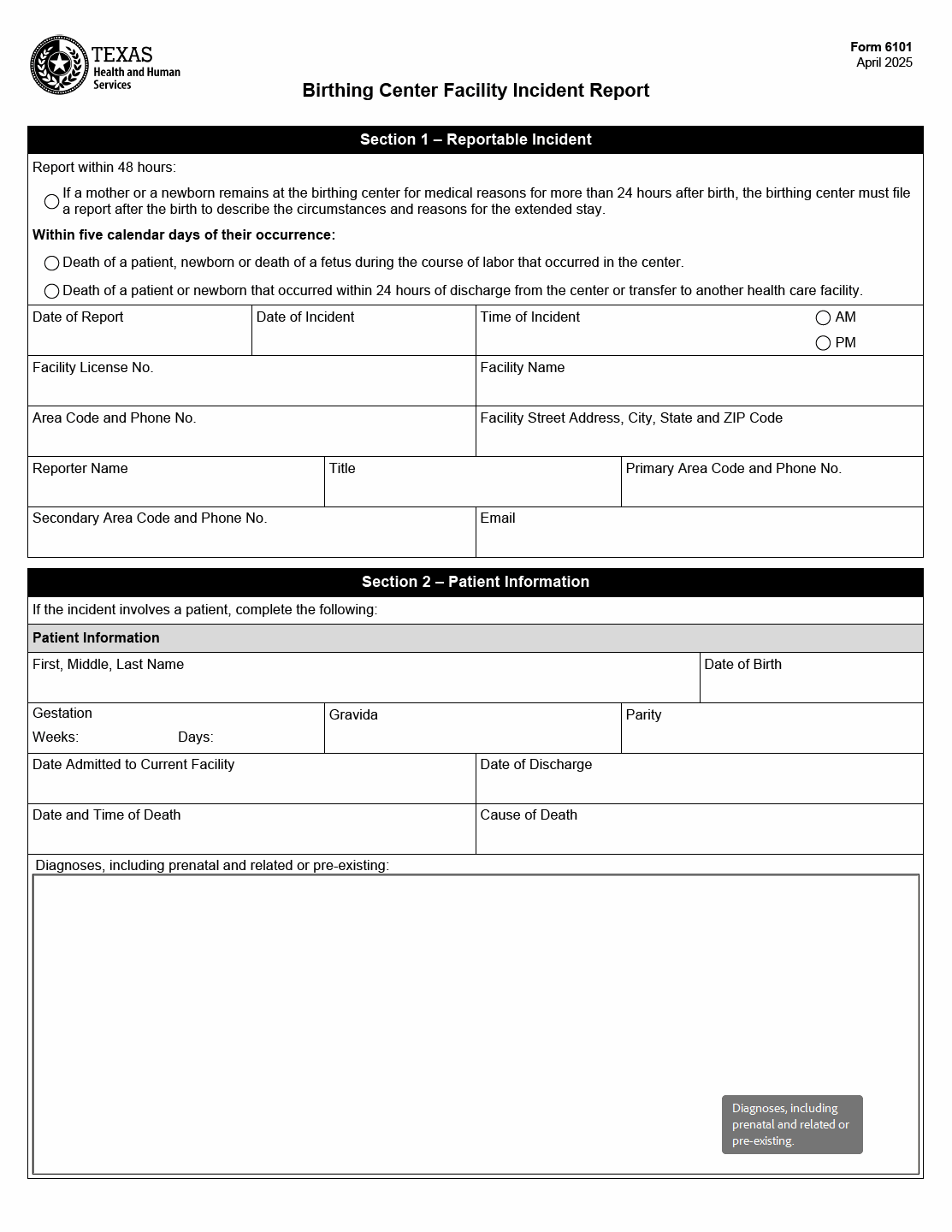TX HHS Form 6101. Birthing Center Facility Incident Report