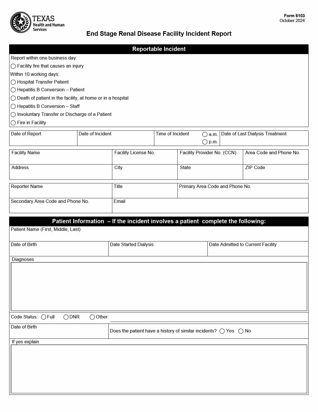 TX HHS Form 6103. End Stage Renal Disease Facility Incident Report