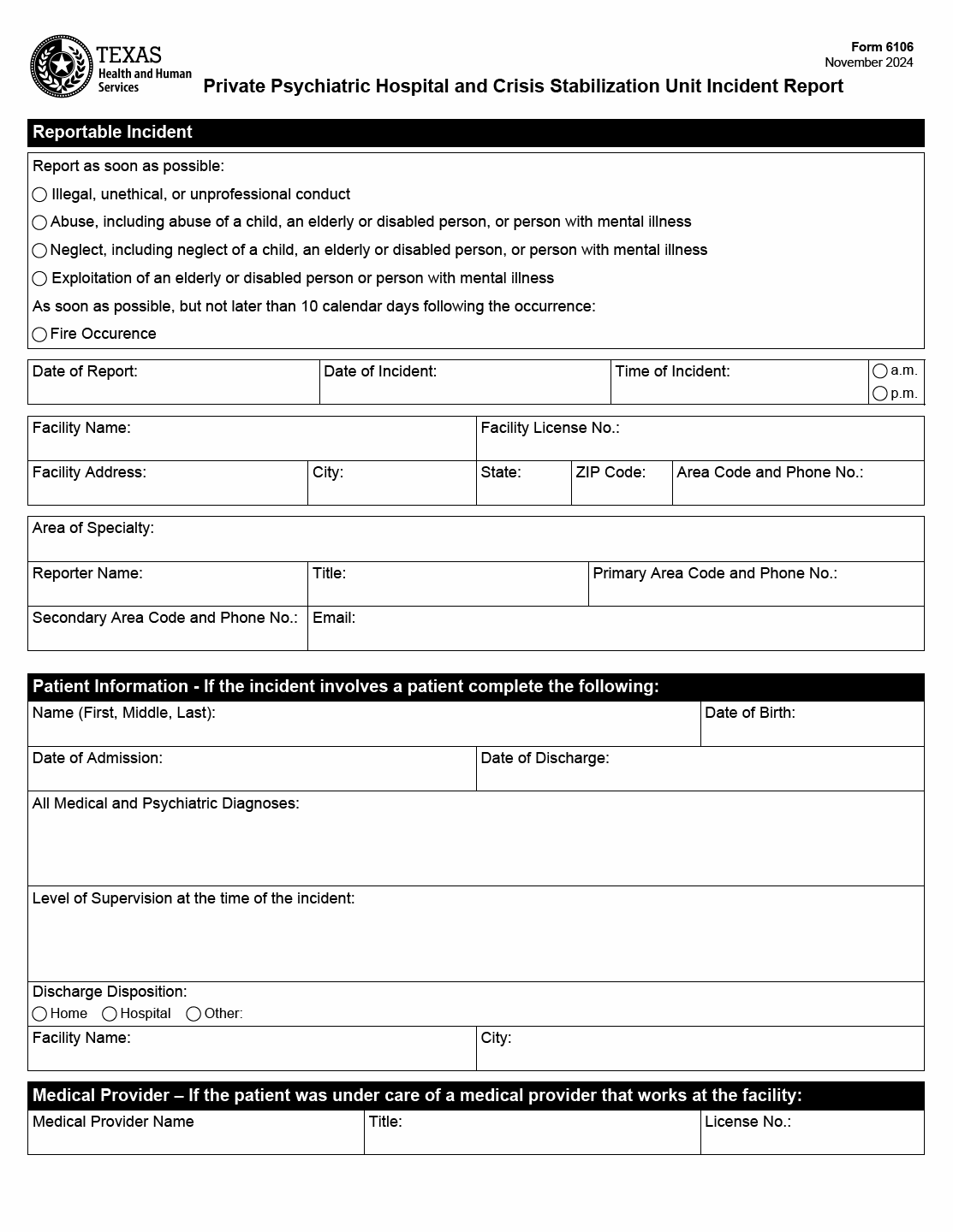 TX HHS Form 6106. Private Psychiatric Hospital and Crisis Stabilization Unit Incident Report