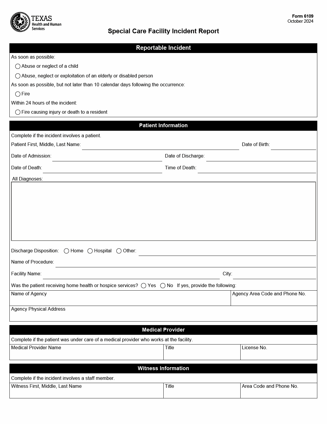 The TX HHS Form 6109, Special Care Facility Incident Report, is a critical document used to report incidents that occur in special care facilities. This form helps facility administrators and staff members document and report incidents such as abuse or neglect of children, elderly, or disabled individuals, fires causing injury or death, and other reportable events.