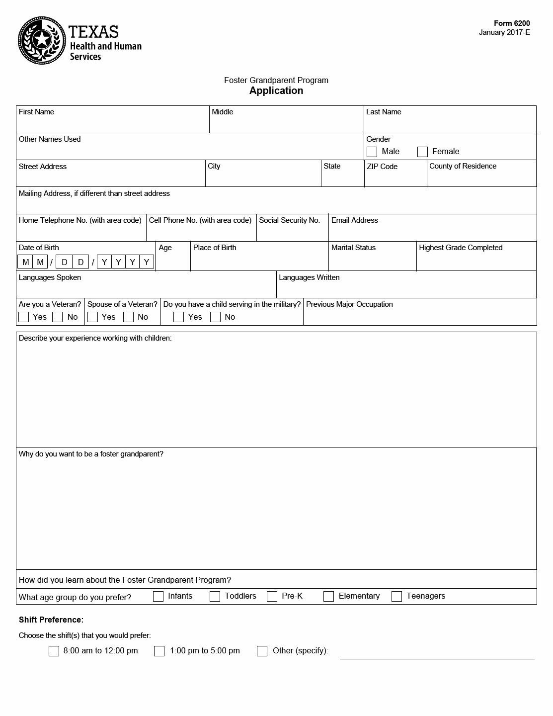 This form should be used by individuals interested in joining the Foster Grandparent Program, which is administered by Texas Health and Human Services (HHS). The TX HHS Form 6200 is essential for applicants to provide the necessary information and demonstrate their suitability for the program. By completing this application, individuals can take the first step towards becoming a foster grandparent and making a positive impact on the lives of children.