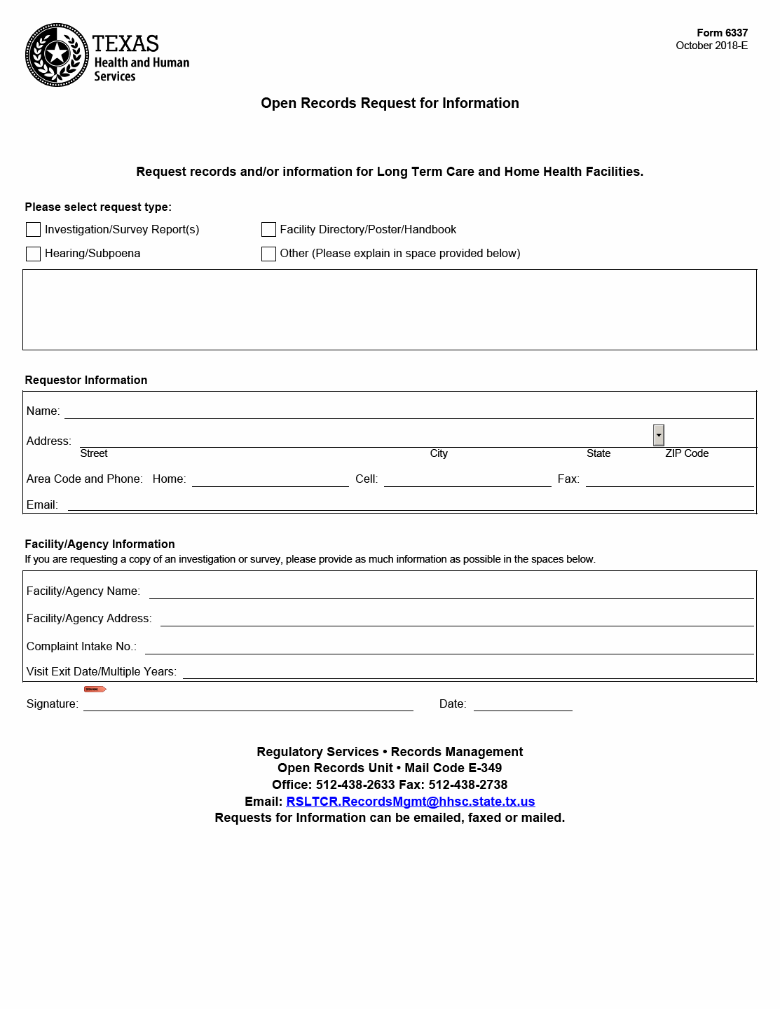 The Open Records Unit of Texas Health and Human Services' Regulatory Services department is responsible for processing requests. Requests can be submitted via email, fax, or mail to the unit's office at 512-438-2633, fax at 512-438-2738, or email at [email protected]. The form number and full title, TX HHS Form 6337, Open Records Request for Information, should be used when submitting requests.
