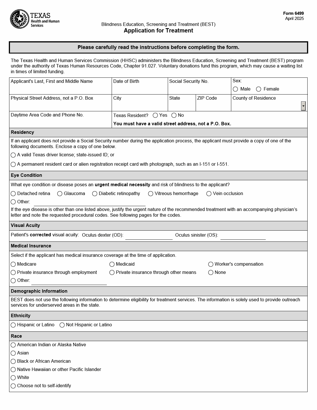 The TX HHS Form 6499, Application for Treatment, is a crucial document that helps individuals apply for treatment services under the Blindness Education, Screening and Treatment (BEST) program. This form should be used by applicants who require urgent medical attention to prevent blindness or address existing eye conditions.