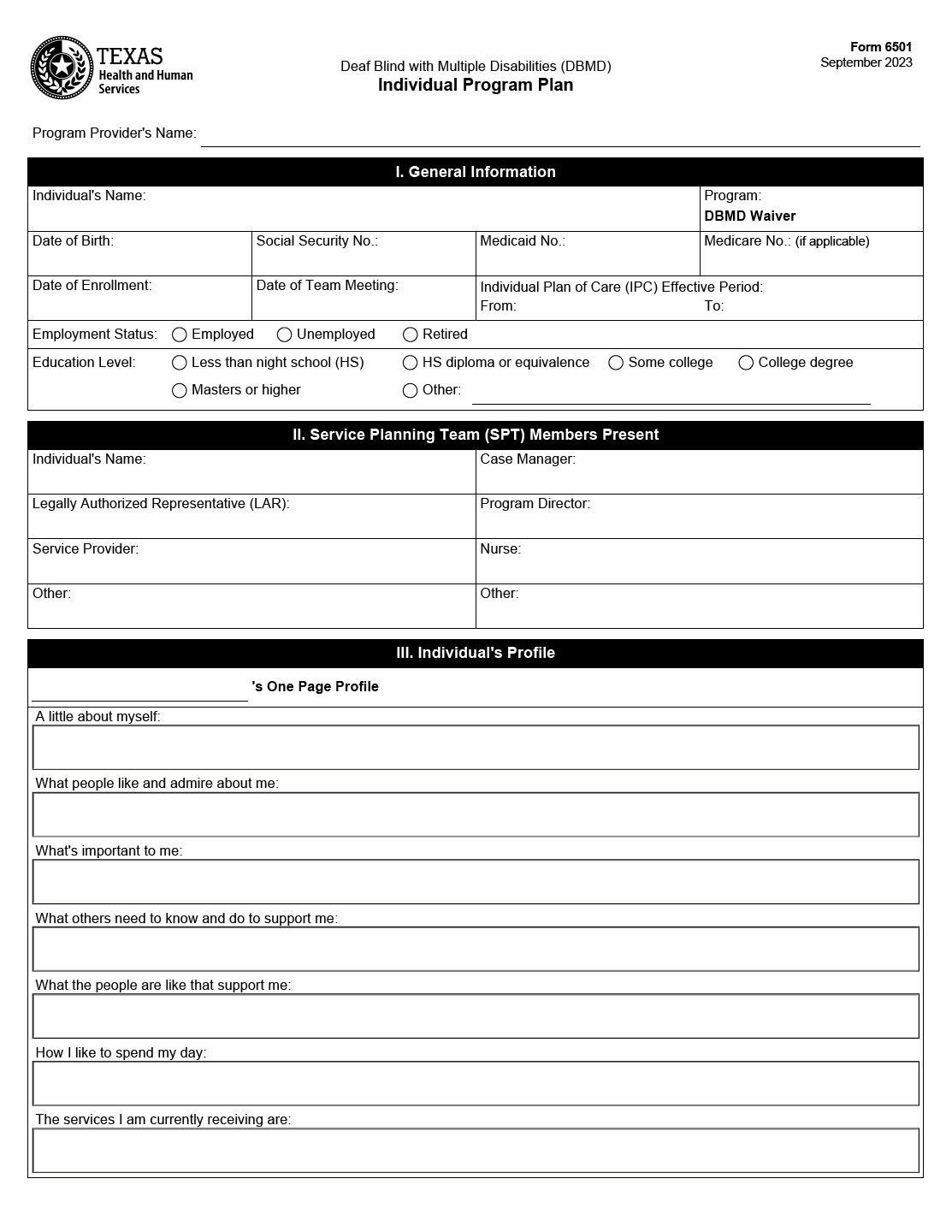 TX HHS Form 6501. Individual Program Plan