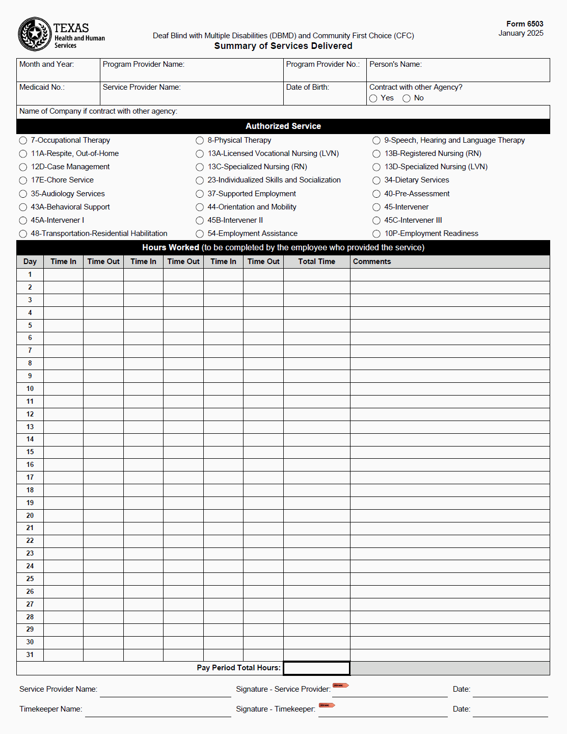 TX HHS Form 6503. DBMD and CFC Summary of Services Delivered