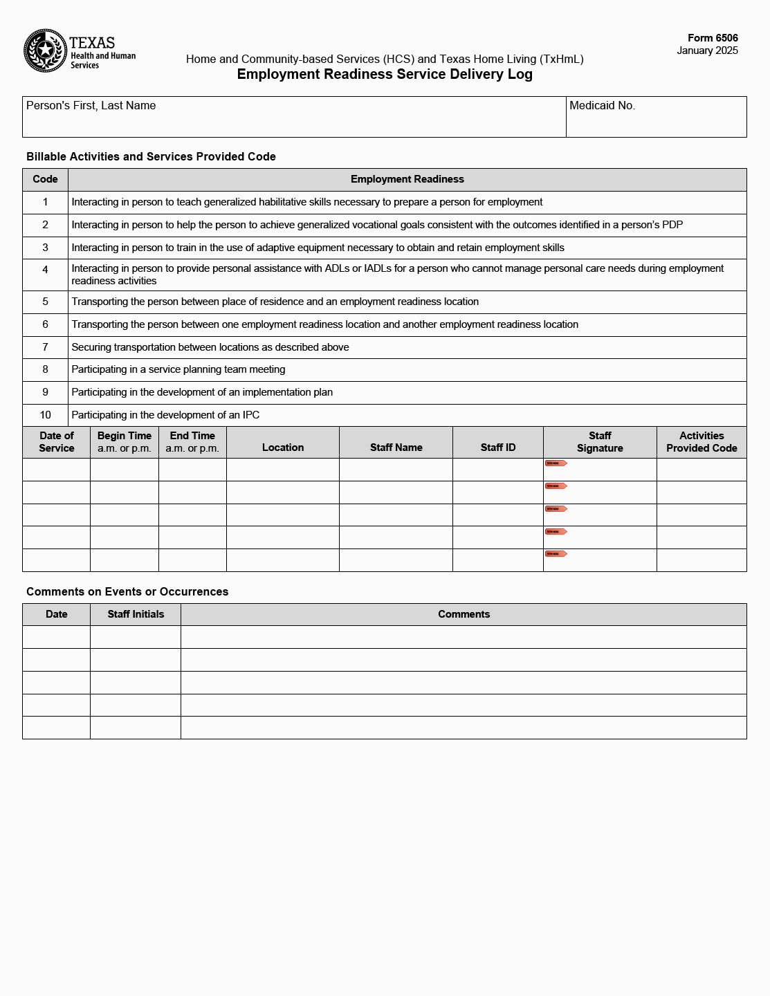 TX HHS Form 6506. Home and Community-based Services (HCS) and Texas Home Living (TxHmL) Employment Readiness Service Delivery Log