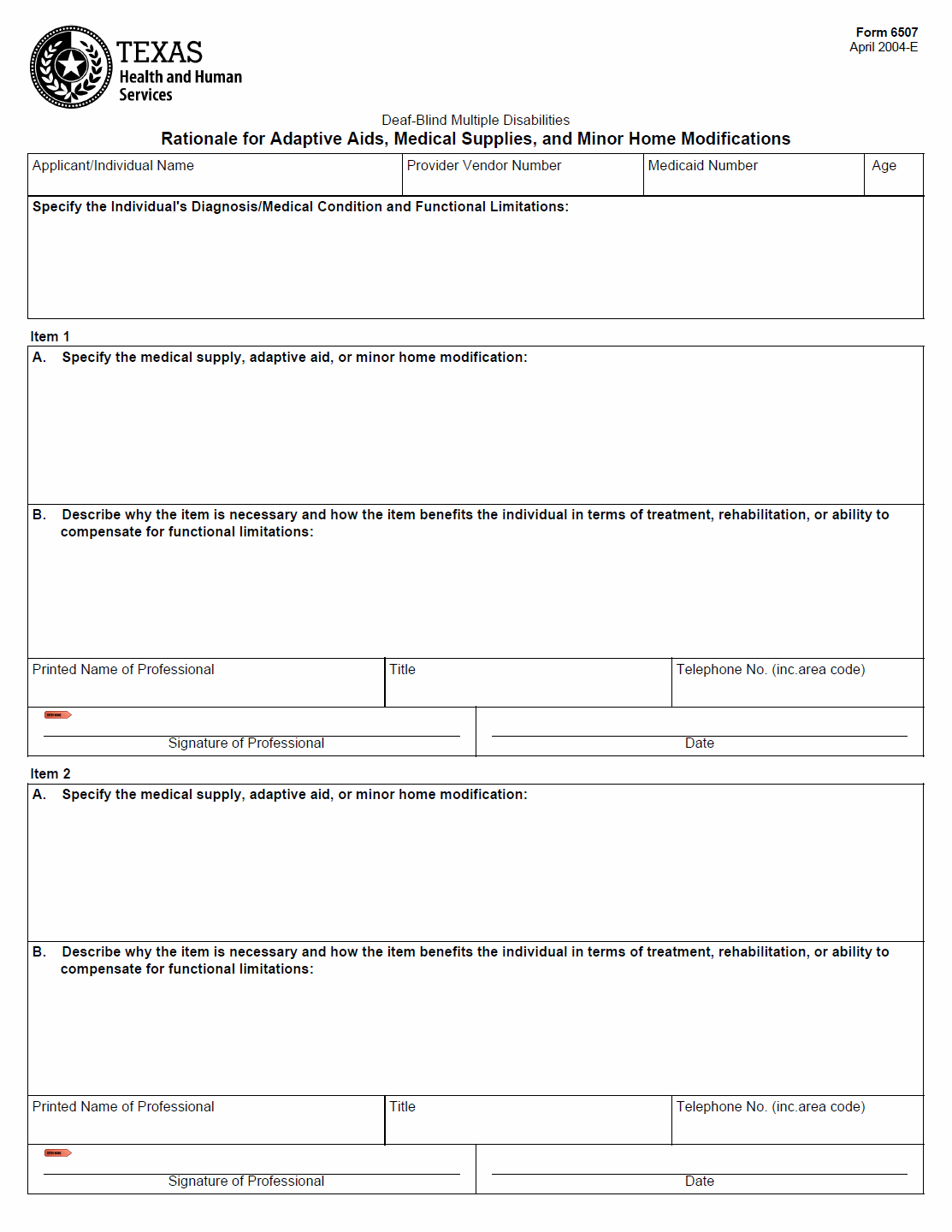 TX HHS Form 6507. Rationale for Adaptive Aids. Medical Supplies. and Minor Home Modifications