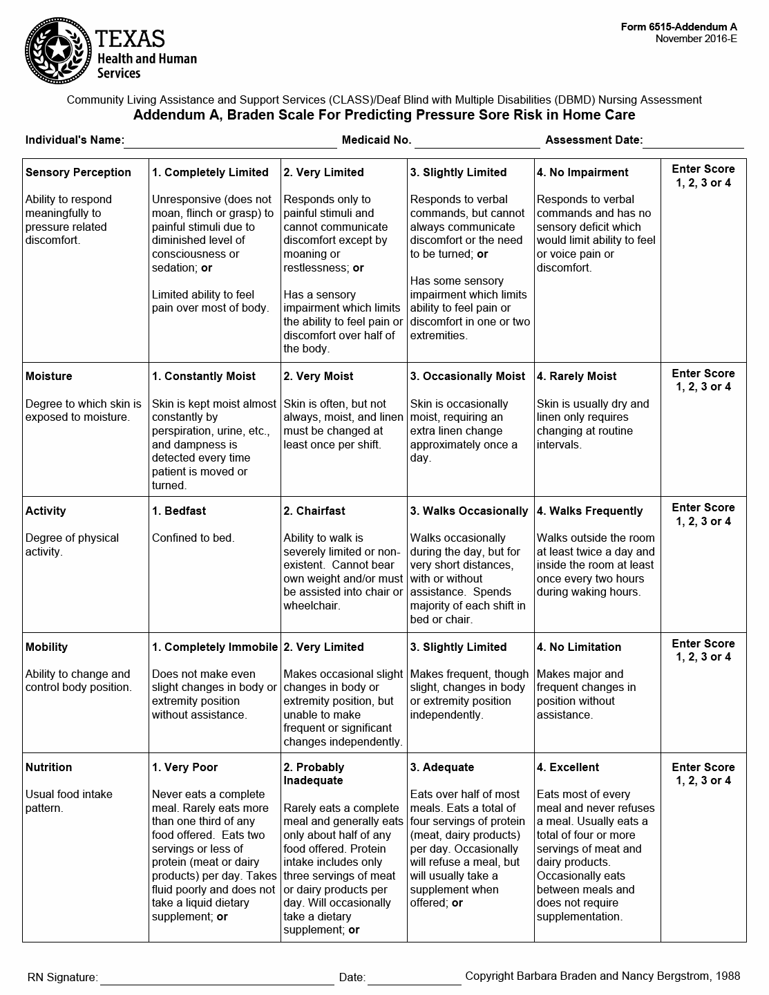 This assessment consists of several sections, including Sensory Perception, Moisture, Activity, Mobility, and Nutrition. The form requires the healthcare professional to evaluate the individual's ability to respond to painful stimuli, their skin moisture levels, physical activity level, mobility, and nutritional intake. The results of this assessment can help inform care planning and reduce the risk of pressure ulcers.