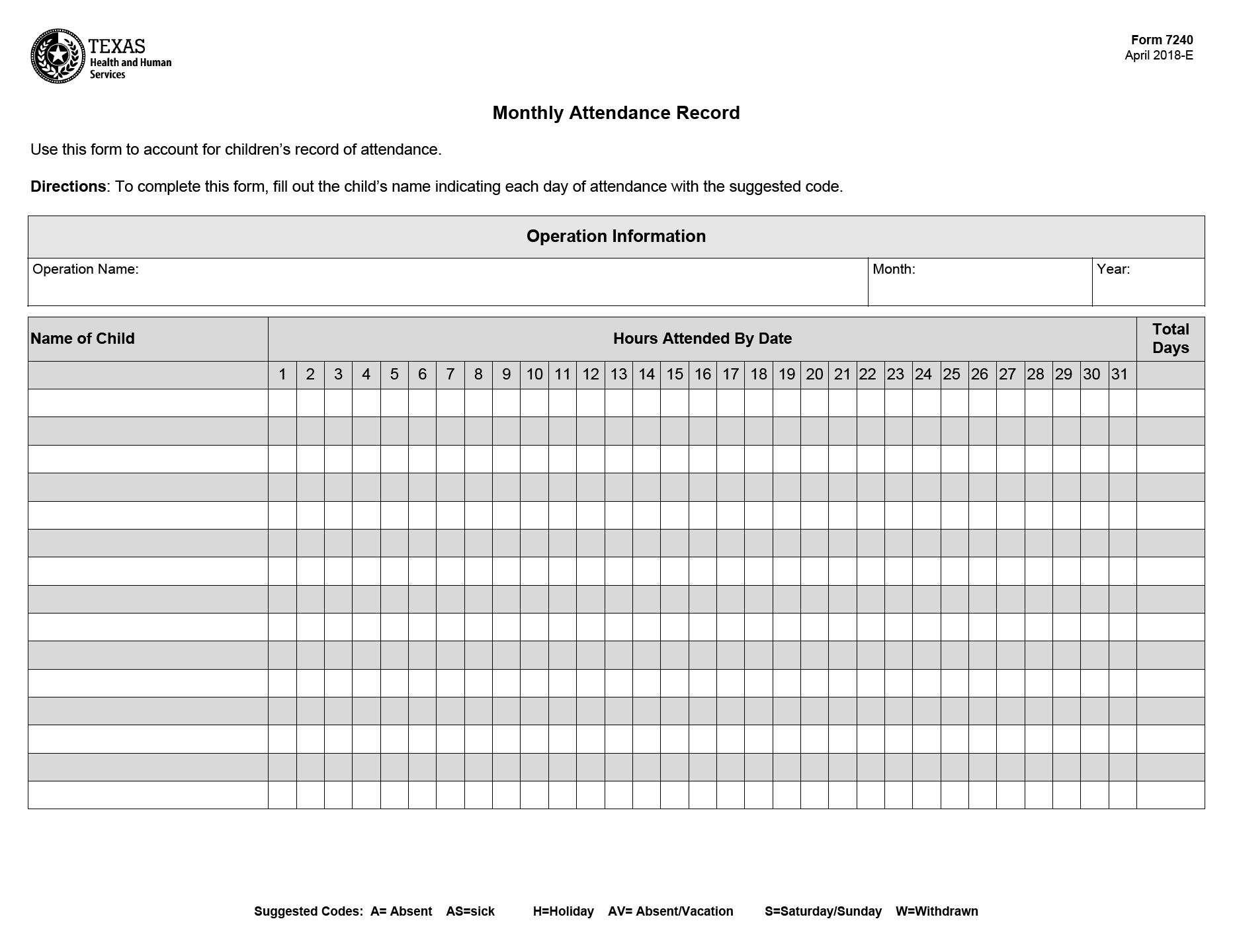 TX HHS Form 7240. Monthly Attendance Record