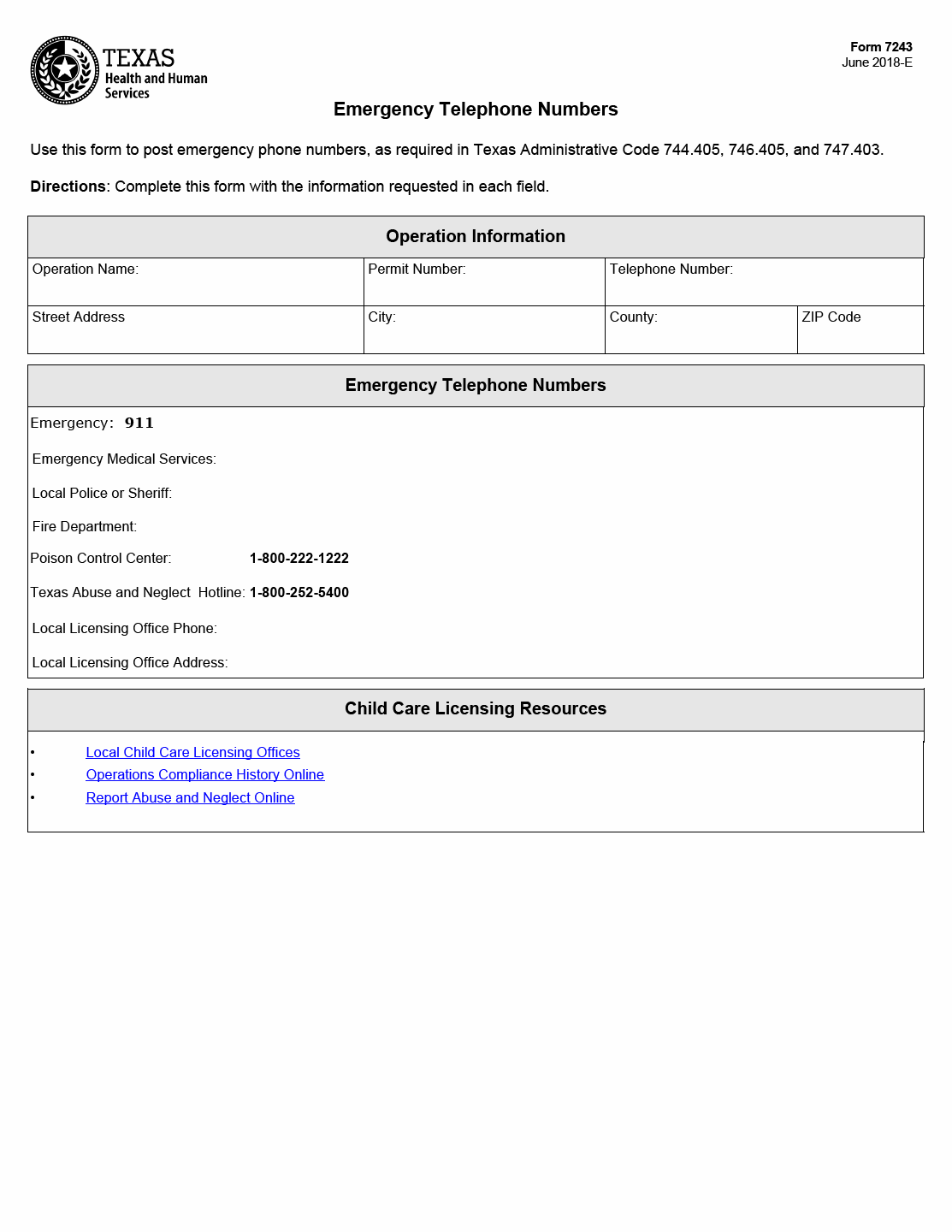 TX HHS Form 7243. Emergency Telephone Numbers