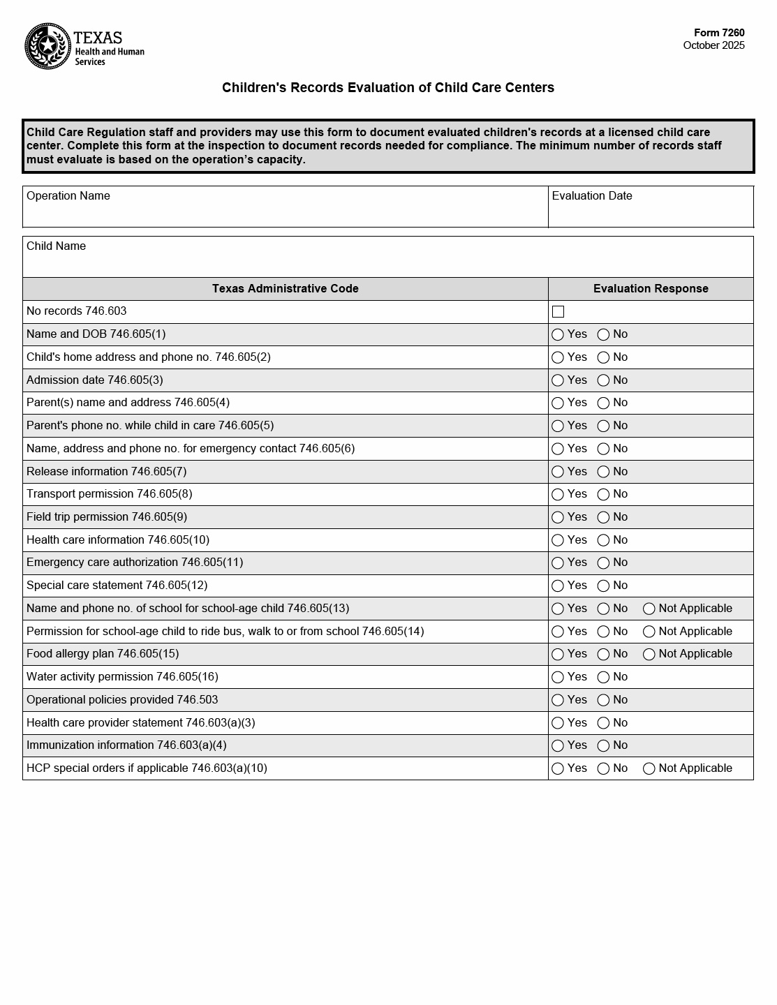 TX HHS Form 7260. Children's Records Evaluation of Child Care Centers