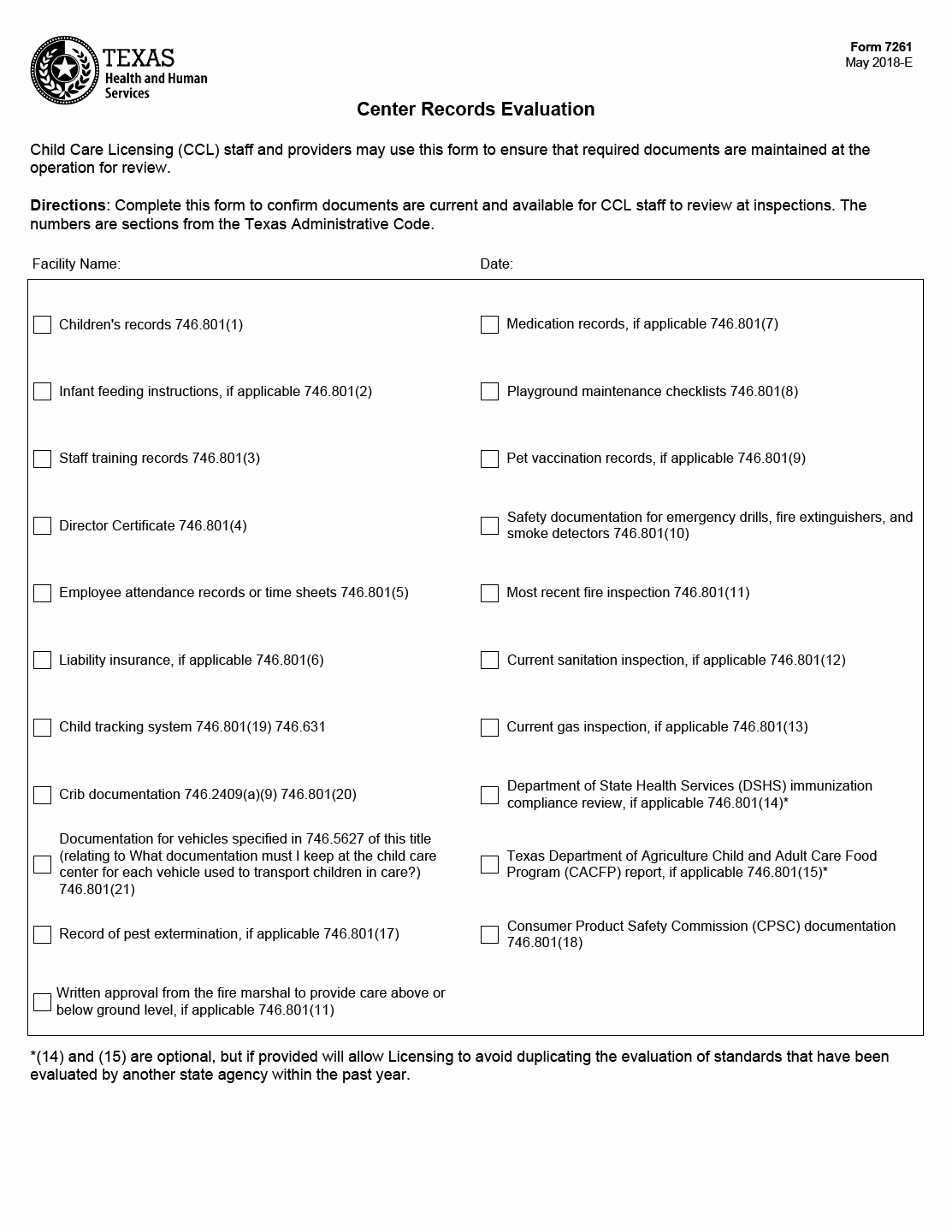 This form should be used by CCL staff and providers to confirm that required documents are current and available for review during inspections. The optional sections 746.801(11), (14), and (15) allow for the evaluation of standards evaluated by another state agency within the past year, which can help avoid duplicating efforts. By using this form, child care providers can demonstrate compliance with regulations and ensure a smooth inspection process.