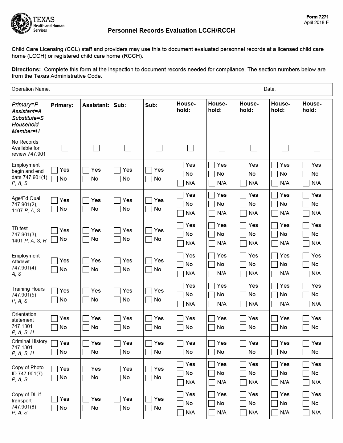 The Personnel Records Evaluation LCCH/RCCH Form 7271 is designed to help CCL staff and providers efficiently document personnel records, ensuring compliance with Texas Administrative Code requirements for licensed child care homes (LCCH) or registered child care homes (RCCH).