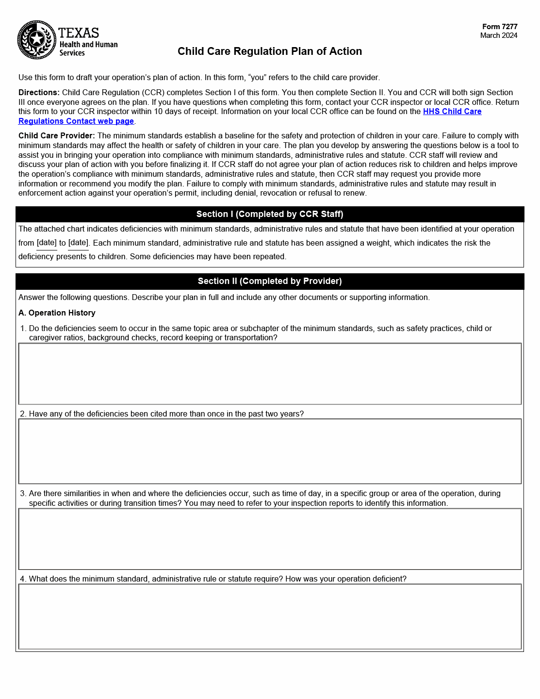 TX HHS Form 7277. Child Care Regulation Plan of Action