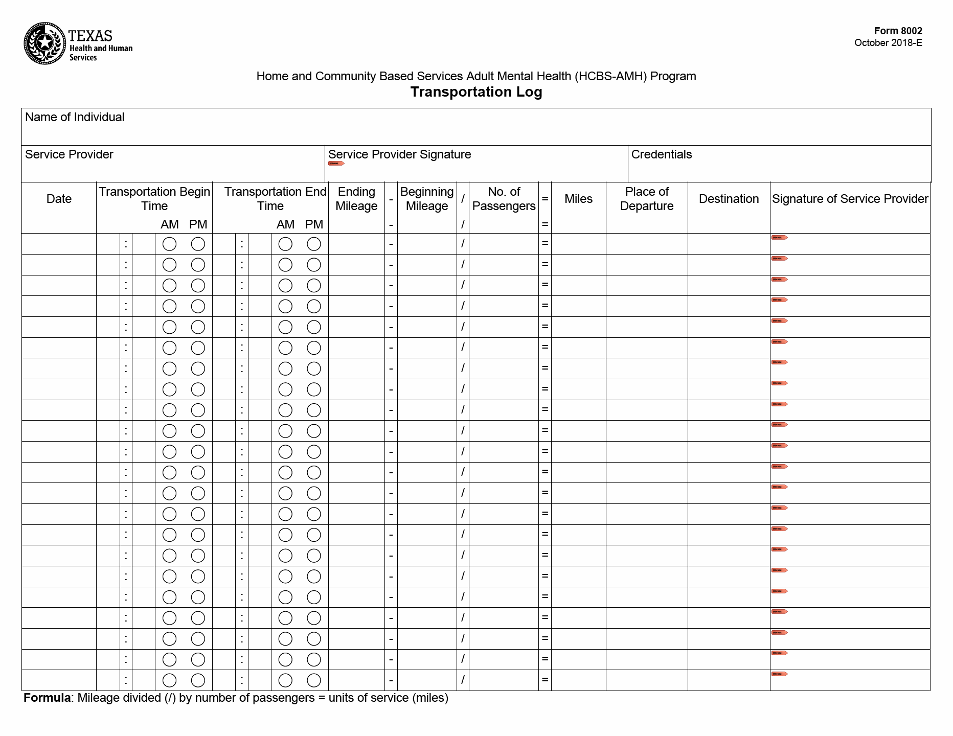 The TX HHS Form 8002, Transportation Log, is a crucial tool for tracking transportation services provided to individuals under the EH' Services Home and Community Based Services Adult Mental Health (HCBS-AMH) Program. This form helps solve the problem of accurately documenting mileage and passenger information, ensuring that program participants receive the necessary support and care.