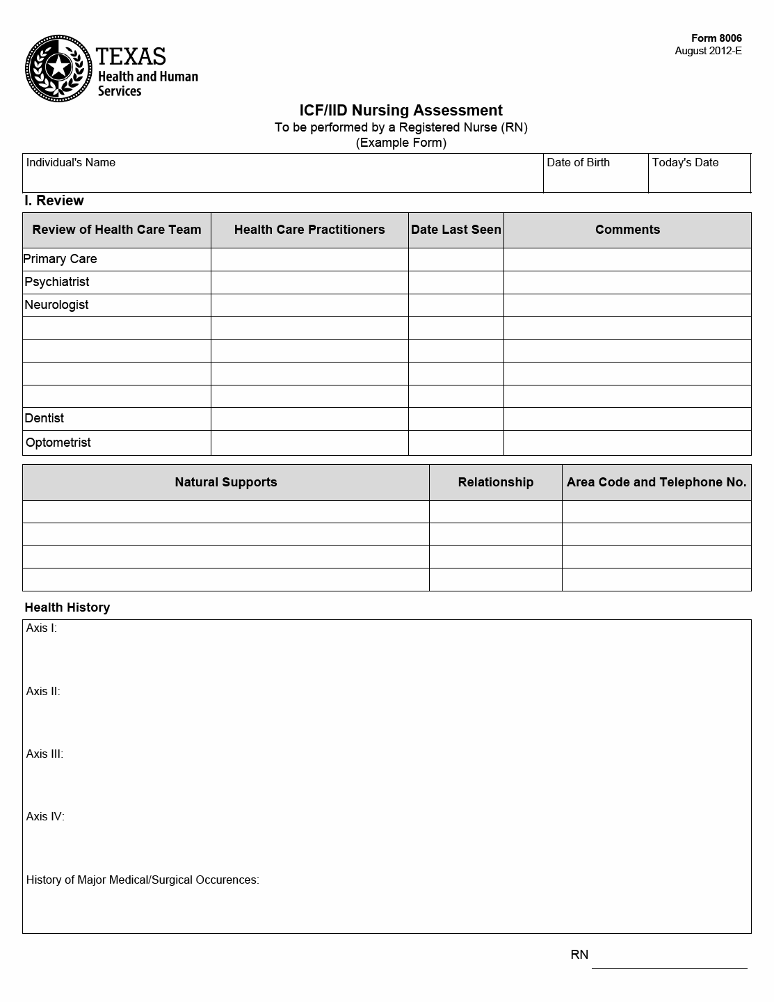 TX HHS Form 8006. ICF/IID Comprehensive Nursing Assessment (Example Form)