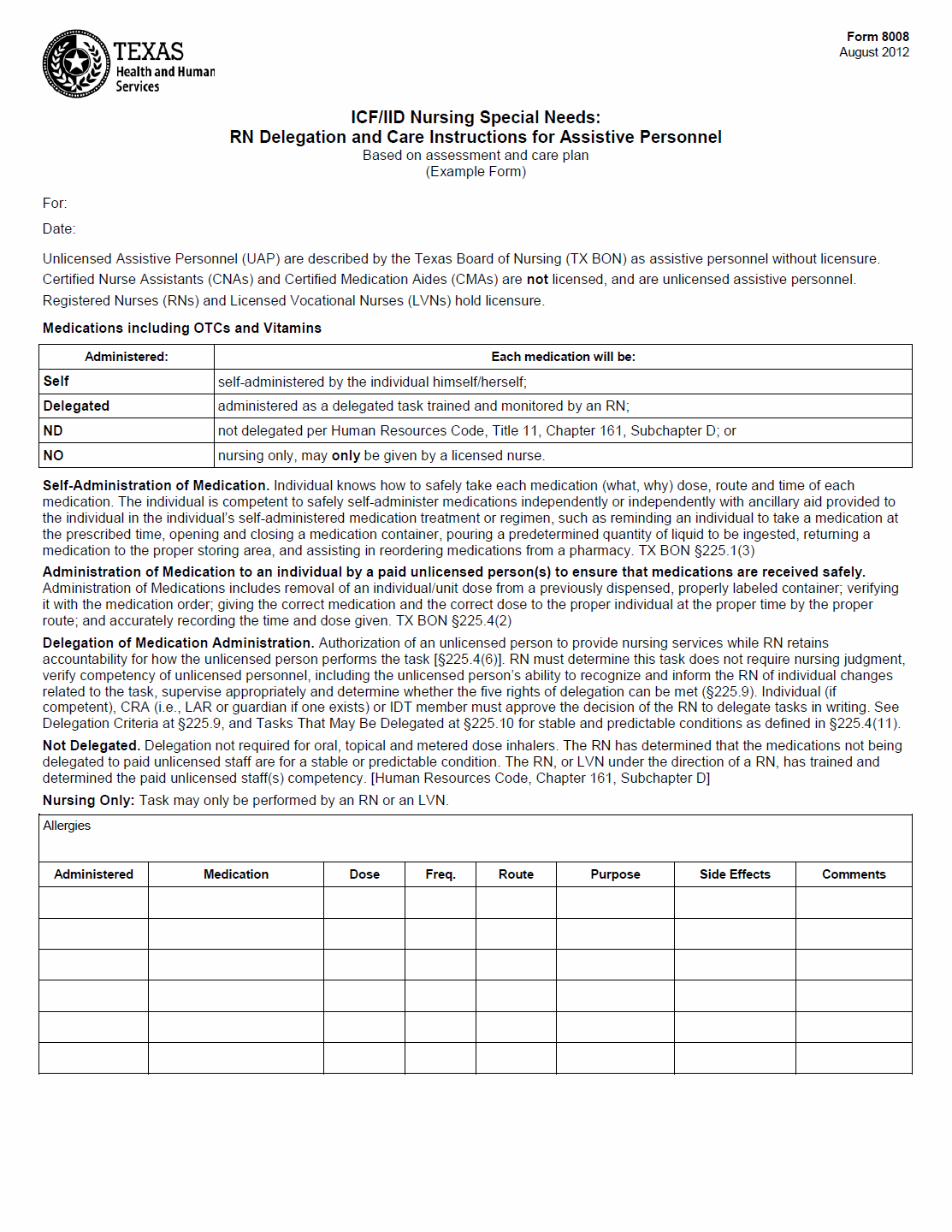 The TX HHS Form 8008, "ICF/IID Nursing Special Needs: RN Delegation and Care Instructions for Assistive Personnel (Example Form)", is a practical guide for Registered Nurses (RNs) to delegate medication administration tasks to unlicensed assistive personnel (UAPs). This form helps solve the problem of ensuring safe and effective medication management in individuals with intellectual or developmental disabilities, while also promoting delegation best practices.