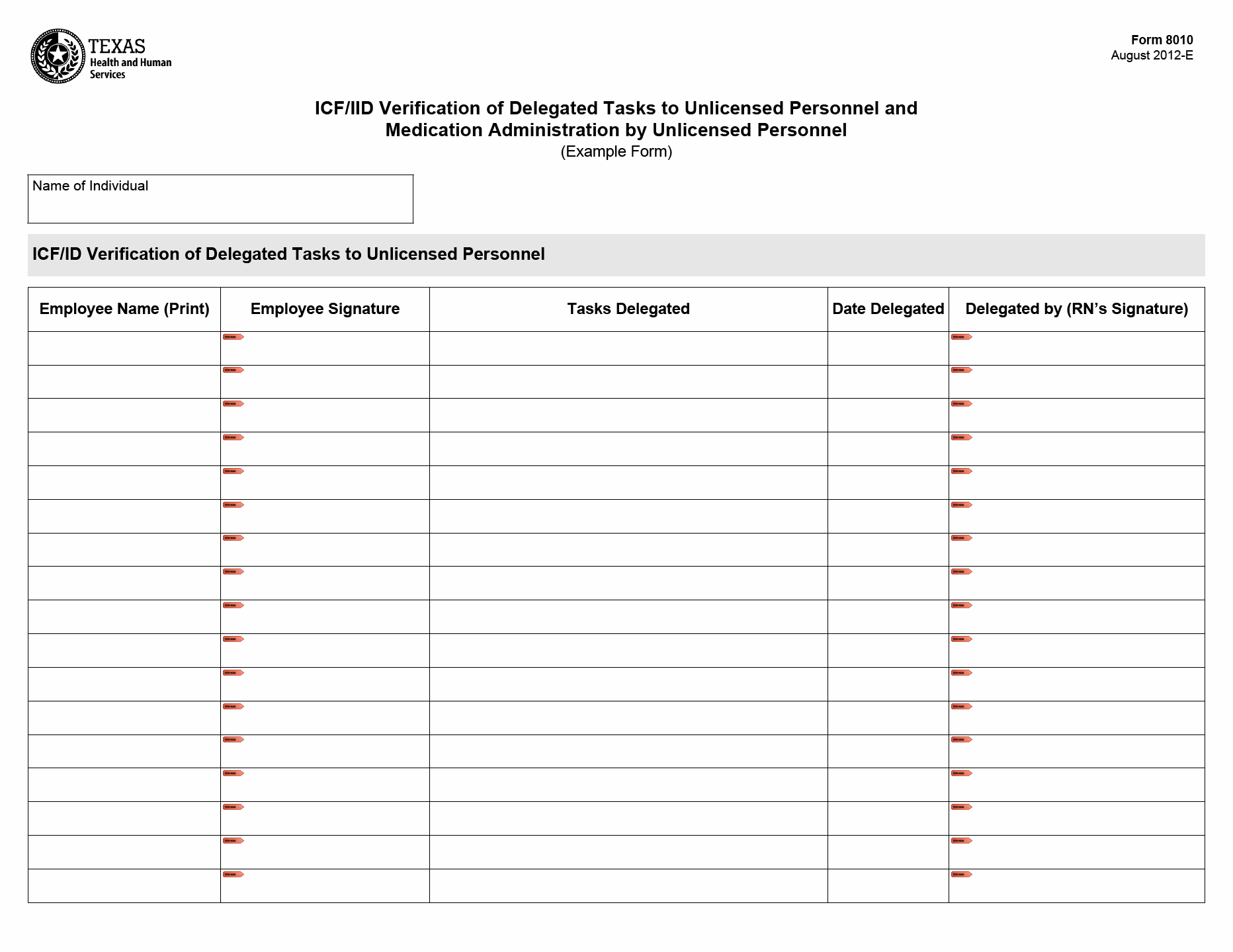 TX HHS Form 8010. ICF/IID Verification of Delegated Tasks to Unlicensed Personnel and Medication Administration by Unlicensed Personnel (Example Form)