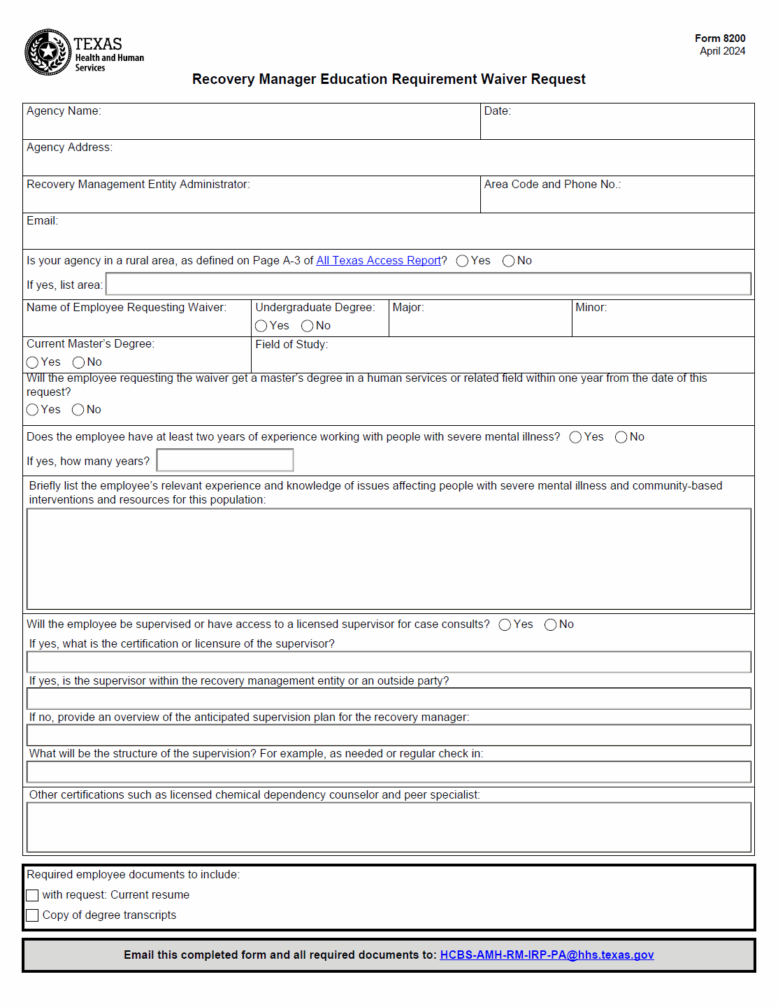 TX HHS Form 8200. Recovery Manager Education Requirement Waiver Request