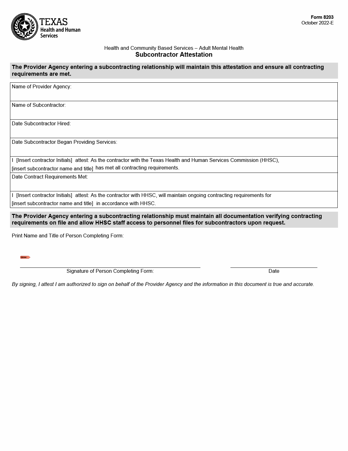 The TX HHS Form 8203, Subcontractor Attestation Form, is a crucial document that helps ensure compliance with contracting requirements when entering into a subcontracting relationship. This form should be used by Provider Agencies to attest to the satisfaction of all necessary conditions before commencing services.