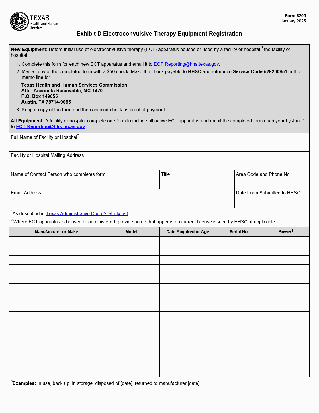 TX HHS Form 8205. Exhibit D Electroconvulsive Therapy Equipment Registration