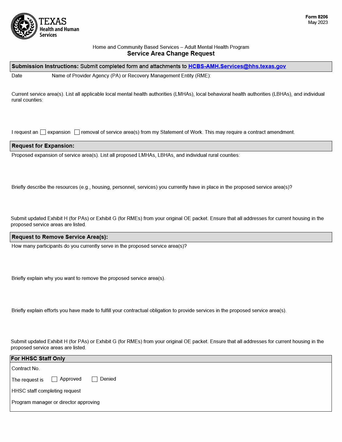 The TX HHS Form 8206, Service Area Change Request, is a crucial document for providers of adult mental health services in Texas. This form helps solve the problem of requesting changes to an existing service area, which may require a contract amendment.