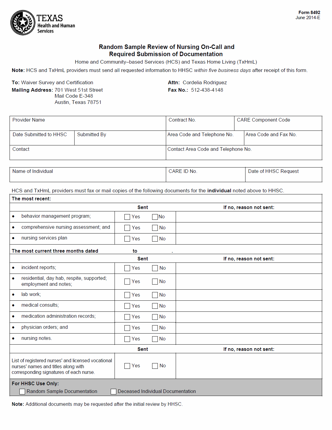 TX HHS Form 8492. Random Sample Review of Nursing On-Call Required Submission of Documentation
