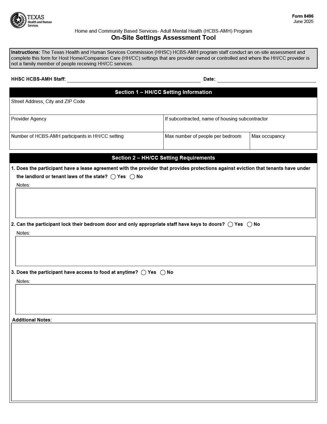TX HHS Form 8496. HCBS-AMH Program On-Site Settings Assessment Tool