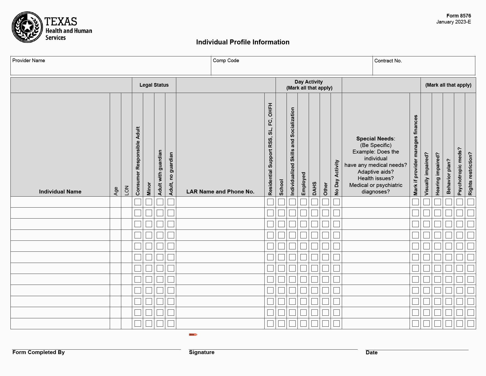 The TX HHS Form 8576, Individual Profile Information, is a crucial document used to gather essential details about an individual's needs. This form helps solve the problem of identifying and addressing unique requirements for individuals with special needs or medical conditions.
