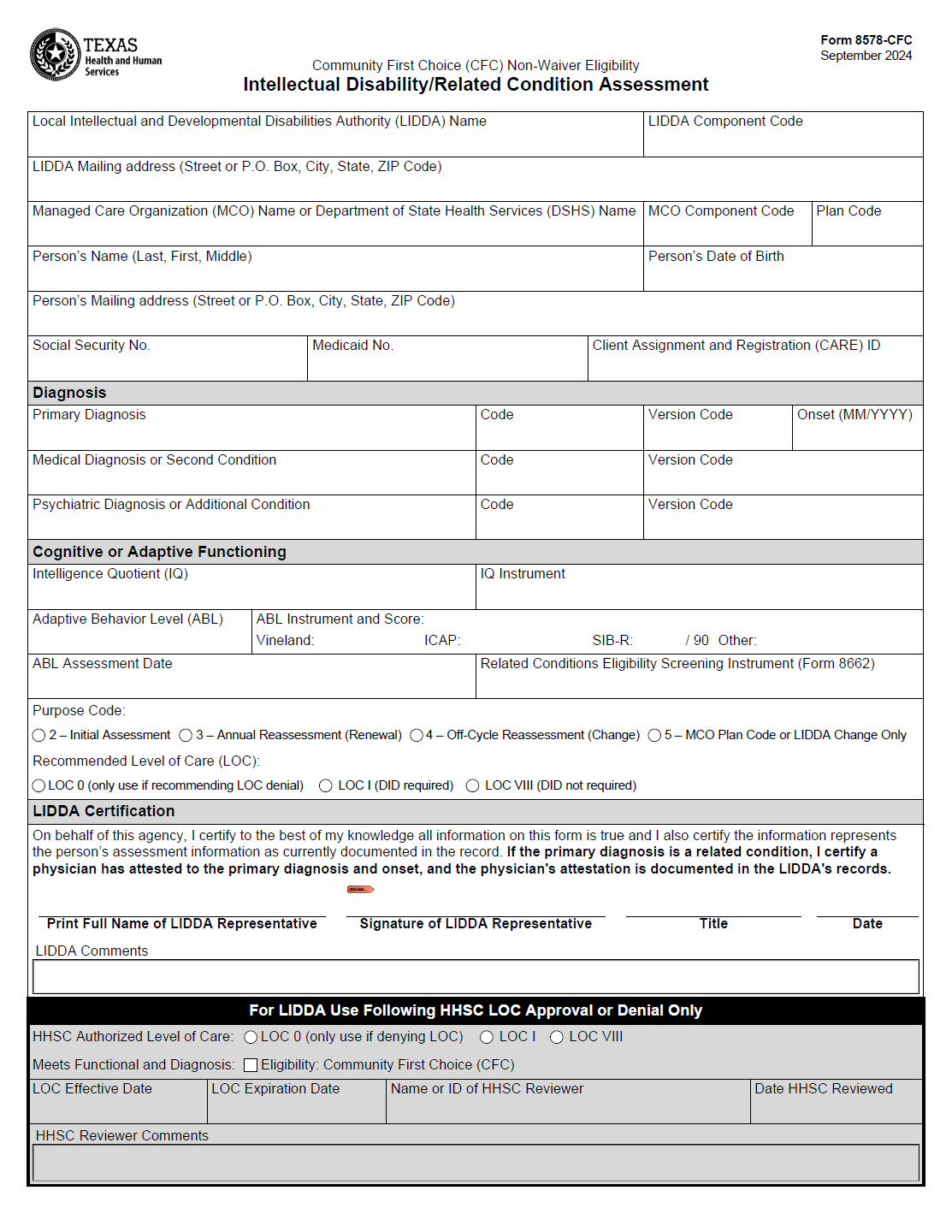 TX HHS Form 8578-CFC. Intellectual Disability/Related Condition Assessment for CFC