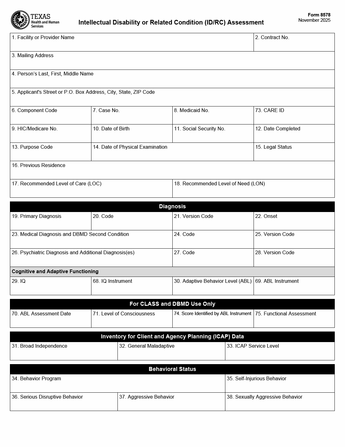 TX HHS Form 8578. Intellectual Disability or Related Conditions Assessment