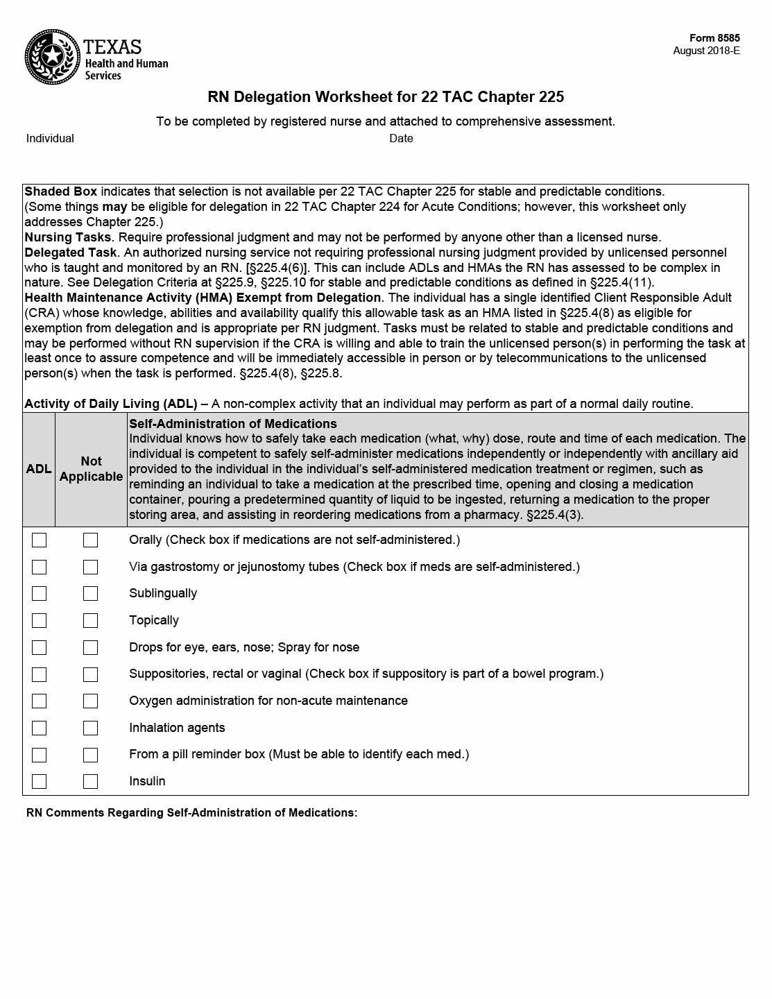 TX HHS Form 8585. RN Delegation Worksheet for 22 TAC Chapter 225