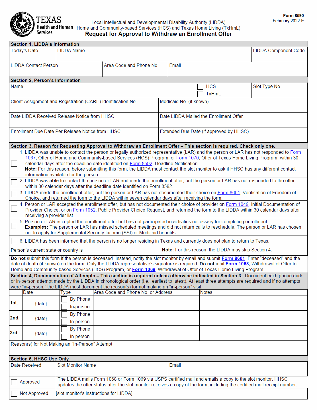 The TX HHS Form 8590 is an essential tool for LIDDA to manage enrollment offers and ensure that individuals receive the necessary services. By using this form, LIDDA can request approval to withdraw an enrollment offer when circumstances change or when there has been no response from the individual or LAR.