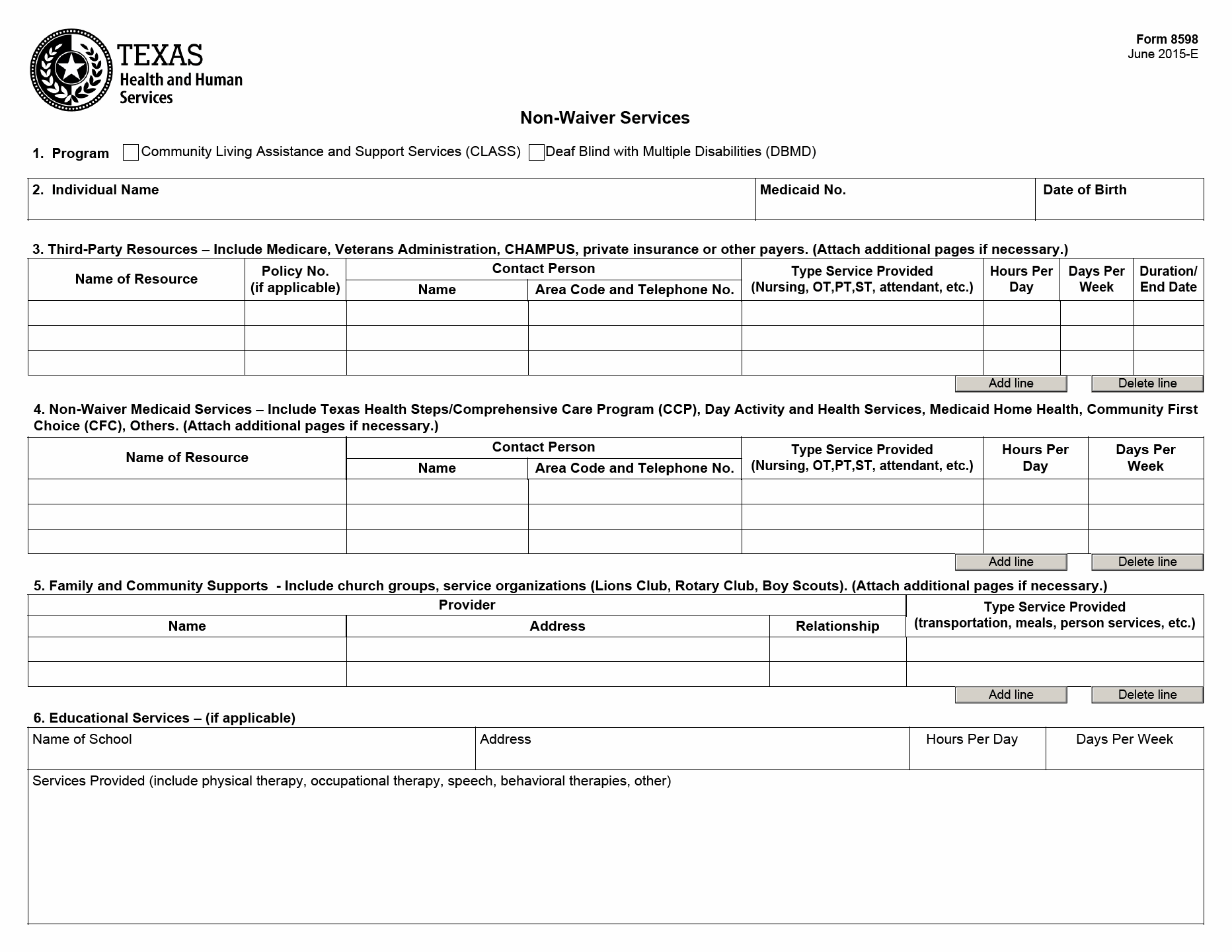 The TX HHS Form 8598, Non-Waiver Services, is a document used to record and track services provided to individuals who require support. This form helps solve the problem of keeping accurate records of non-waiver Medicaid services, including Community Living Assistance and Support Services (CLASS) and Deaf Blind with Multiple Disabilities (DBMD), among others.