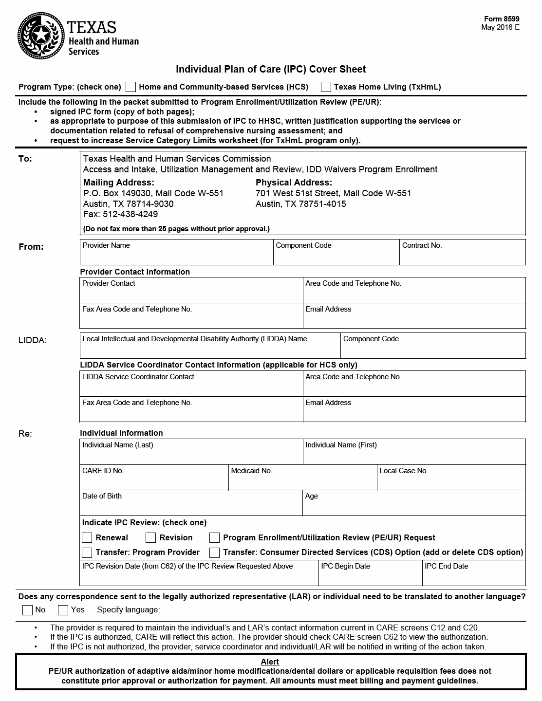 TX HHS Form 8599. Individual Plan of Care (IPC) Cover Sheet