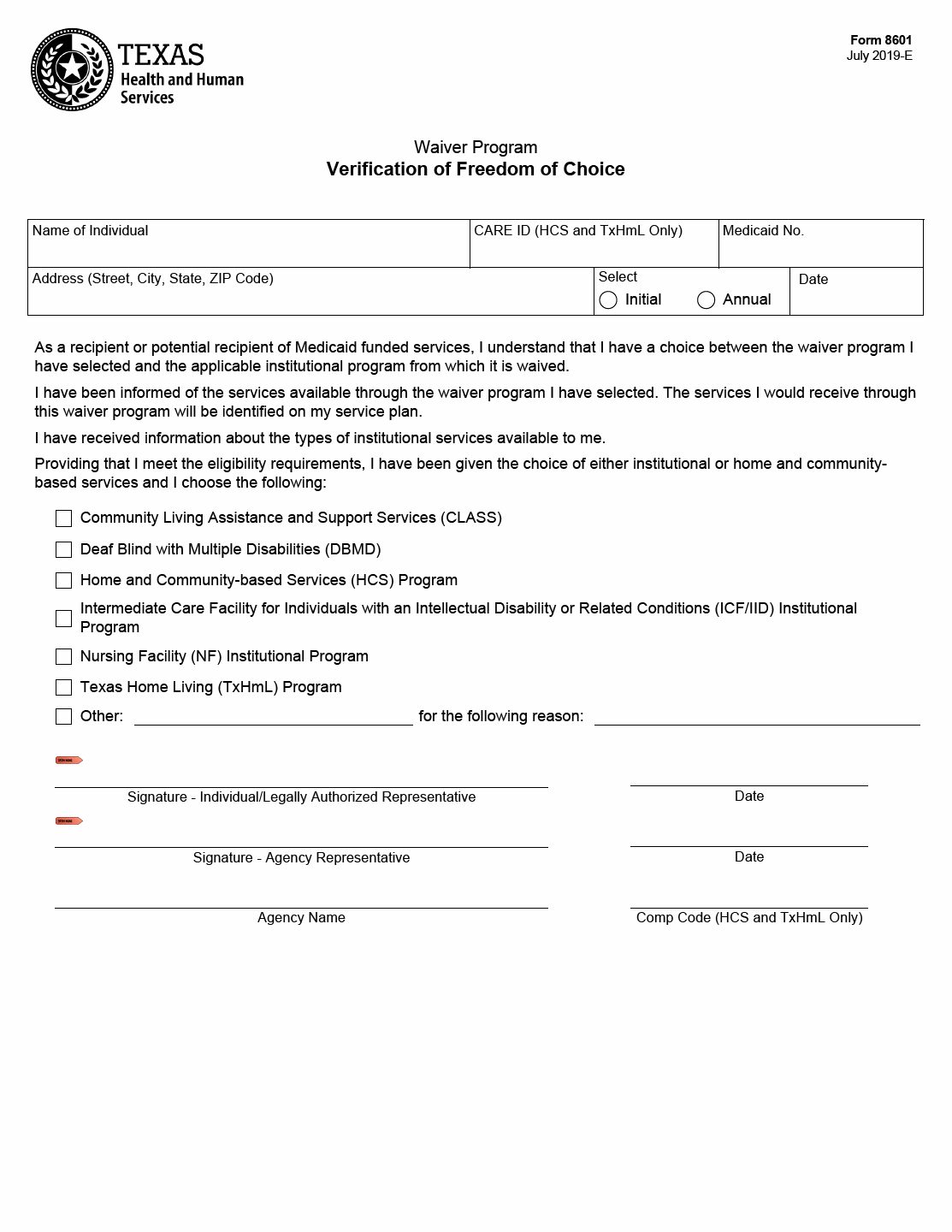 The TX HHS Form 8601, Verification of Freedom of Choice, is a crucial document for recipients or potential recipients of Medicaid-funded services in Texas. This form helps ensure that individuals understand their options between waiver programs and institutional programs.